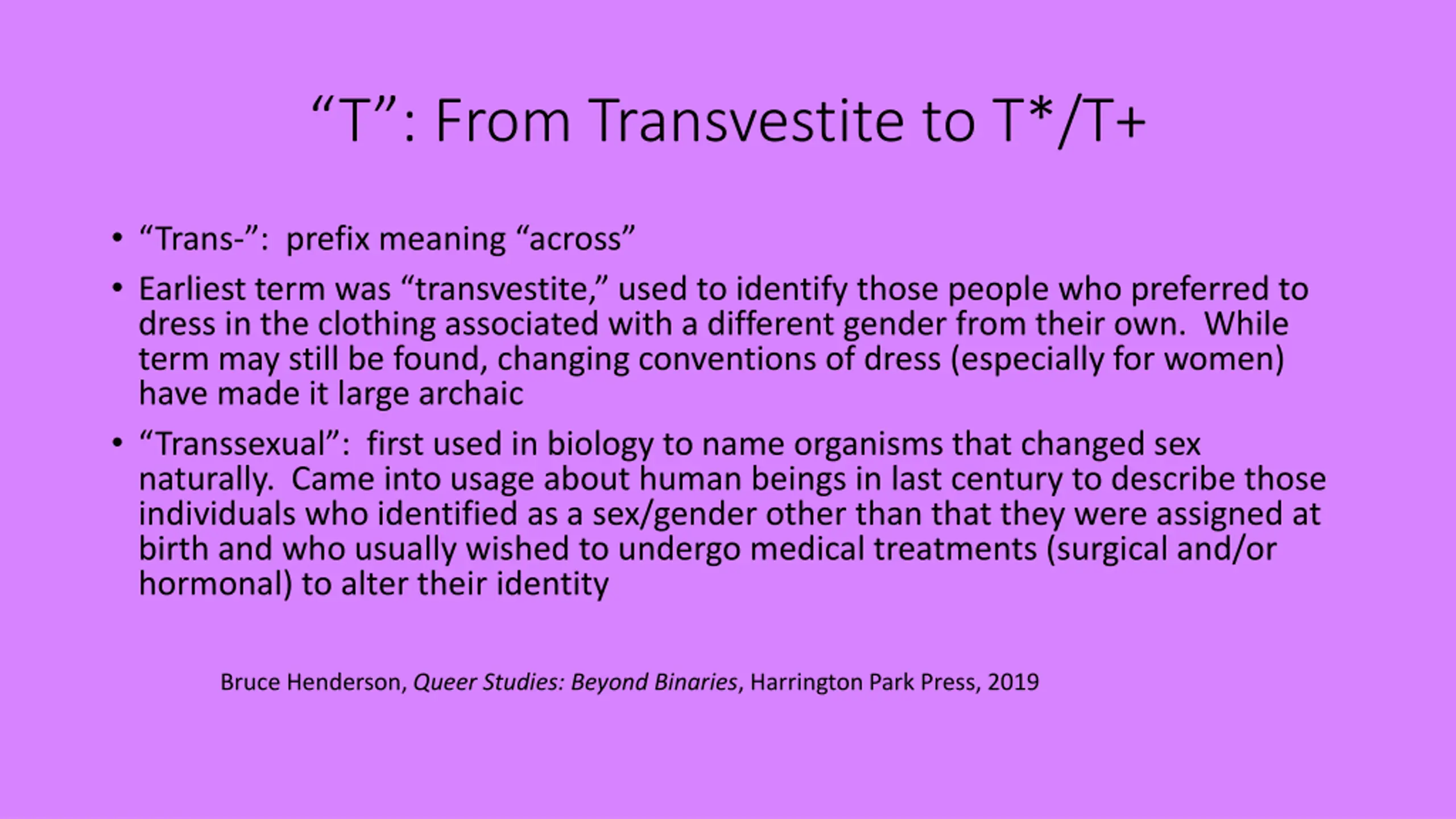 T: From Transvestite to T*/T+ Trans- : prefix meaning across Earliest term was transvestite, used to identify those people who preferred to dress in the clothing associated with a different gender from their own. While term may still be found, changing conventions of dress (especially for women) have made it large archaic Transsexual : first used in biology to name organisms that changed sex naturally. Came into usage about human beings in last century to describe those individuals who identified as a sex/gender other than that they were assigned at birth and who usually wished to undergo medical treatments (surgical and/or hormonal) to alter their identity Bruce Henderson, Queer Studies: Beyond Binaries, Harrington Park Press, 2019