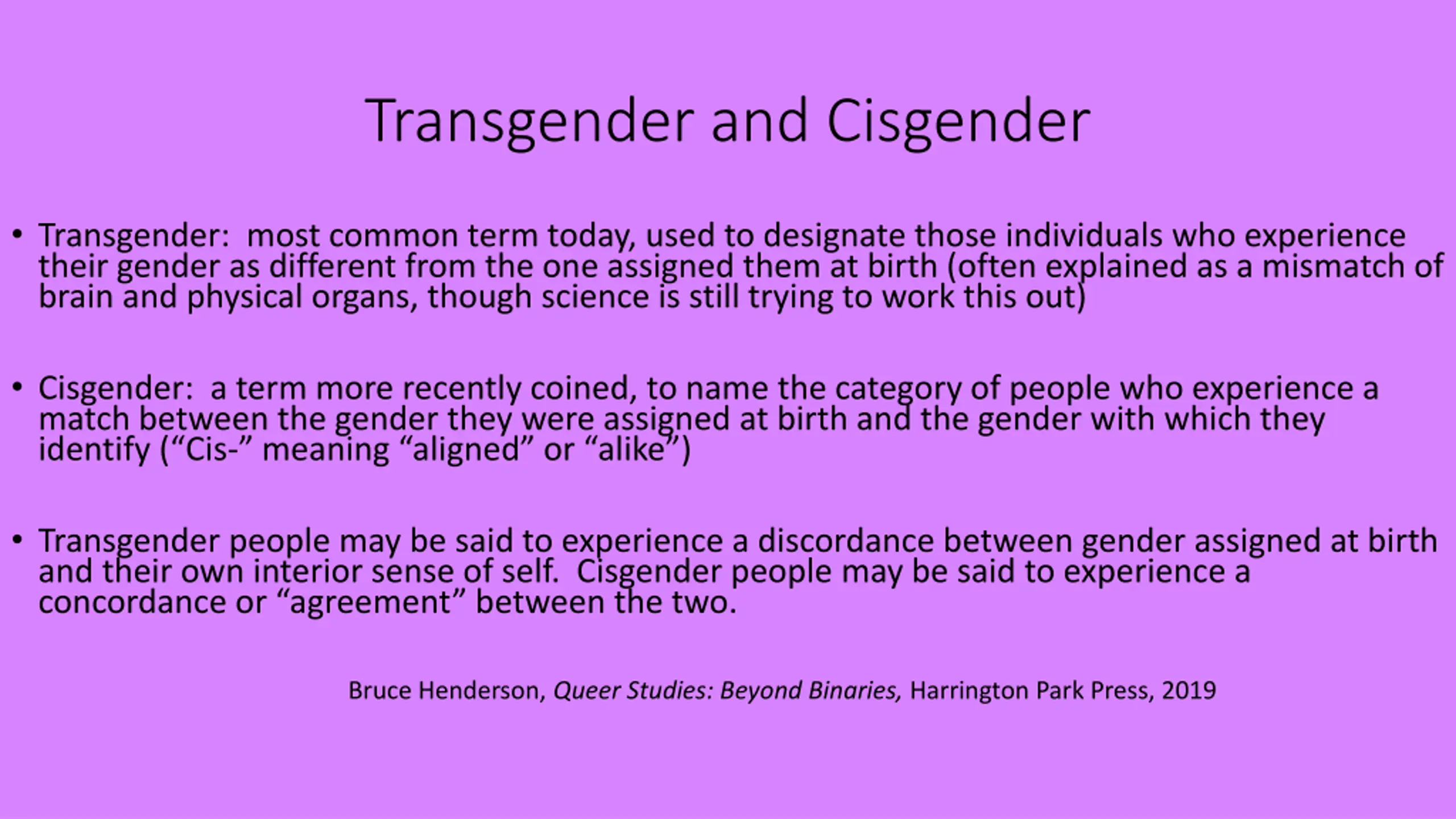 Transgender and Cisgender Transgender: most common term today, used to designate those individuals who experience their gender as different from the one assigned them at birth (often explained as a mismatch of brain and physical organs, though science is still trying to work this out) Cisgender: a term more recently coined, to name the category of people who experience a match between the gender they were assigned at birth and the gender with which they identify ( Cis- meaning aligned or alike ) Transgender people may be said to experience a discordance between gender assigned at birth and their own interior sense of self. Cisgender people may be said to experience a concordance or agreement between the two. Bruce Henderson, Queer Studies: Beyond Binaries, Harrington Park Press, 2019