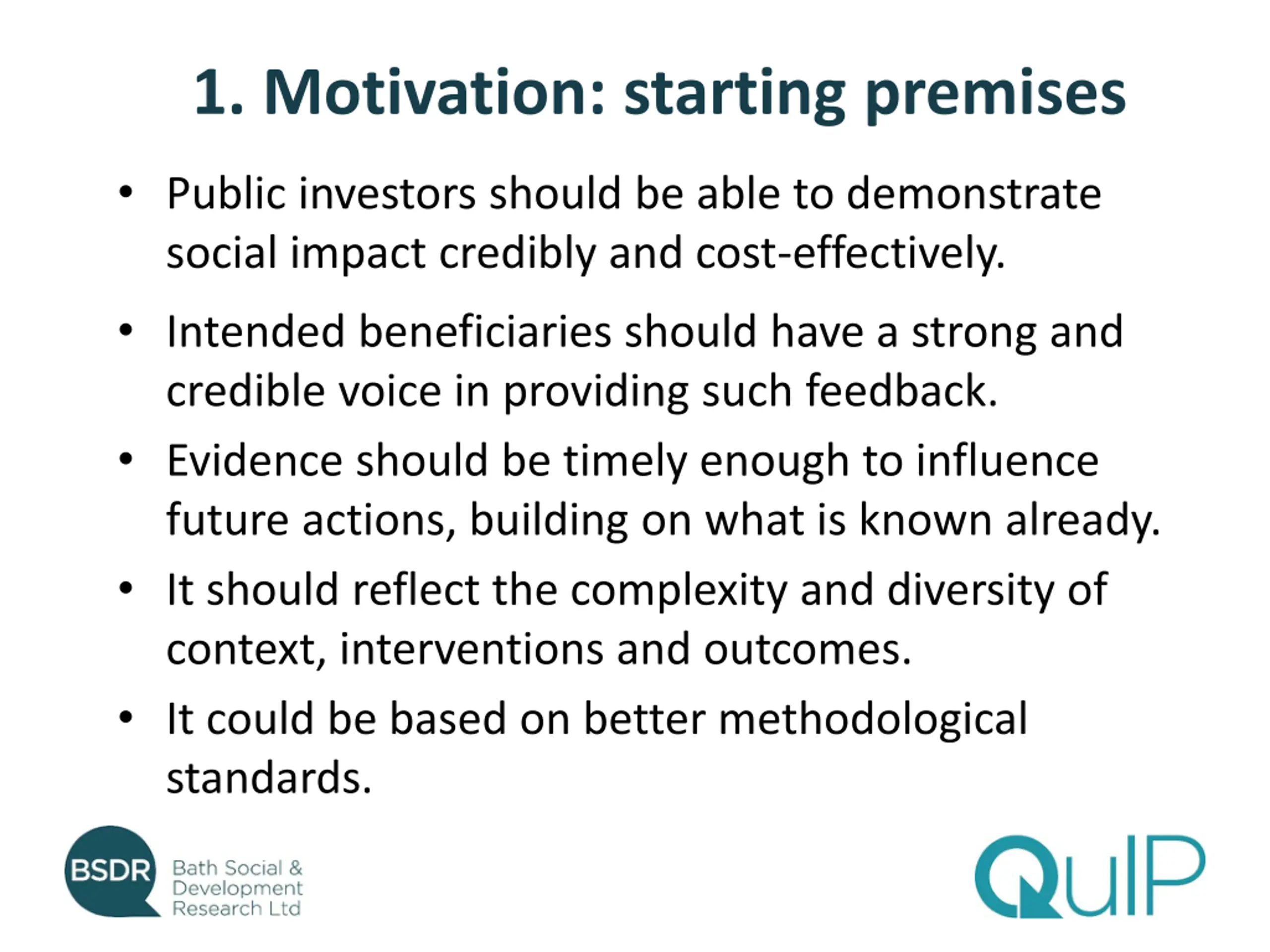 1. Motivation: starting premises Public investors should be able to demonstrate social impact credibly and cost-effectively. Intended beneficiaries should have a strong and credible voice in providing such feedback. Evidence should be timely enough to influence future actions, building on what is known already. It should reflect the complexity and diversity of context, interventions and outcomes. It could be based on better methodological standards.