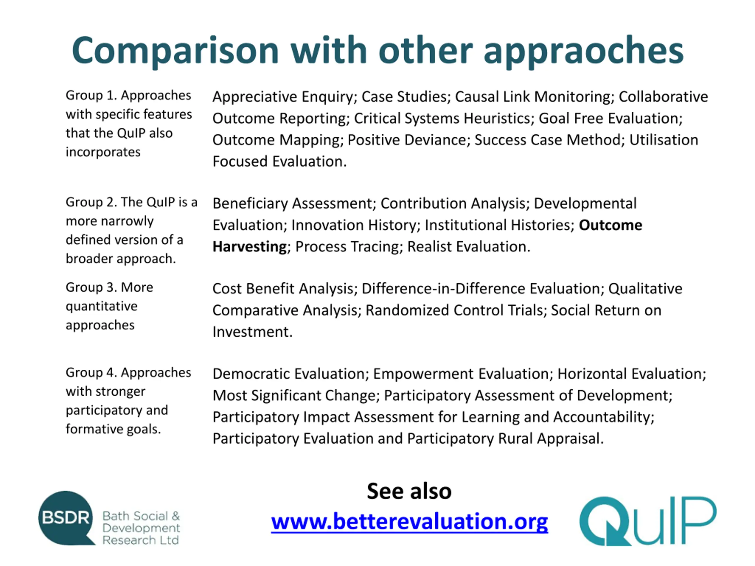 Comparison with other appraoches Group 1. Approaches with specific features that the QuIP also incorporates Appreciative Enquiry; Case Studies; Causal Link Monitoring; Collaborative Outcome Reporting; Critical Systems Heuristics; Goal Free Evaluation; Outcome Mapping; Positive Deviance; Success Case Method; Utilisation Focused Evaluation. Group 2. The QuIP is a more narrowly defined version of a broader approach. Beneficiary Assessment; Contribution Analysis; Developmental Evaluation; Innovation History; Institutional Histories; Outcome Harvesting; Process Tracing; Realist Evaluation. Group 3. More quantitative approaches Cost Benefit Analysis; Difference-in-Difference Evaluation; Qualitative Comparative Analysis; Randomized Control Trials; Social Return on Investment. Group 4. Approaches with stronger participatory and formative goals. Democratic Evaluation; Empowerment Evaluation; Horizontal Evaluation; Most Significant Change; Participatory Assessment of Development; Participatory Impact Assessment for Learning and Accountability; Participatory Evaluation and Participatory Rural Appraisal. See also www.betterevaluation.org