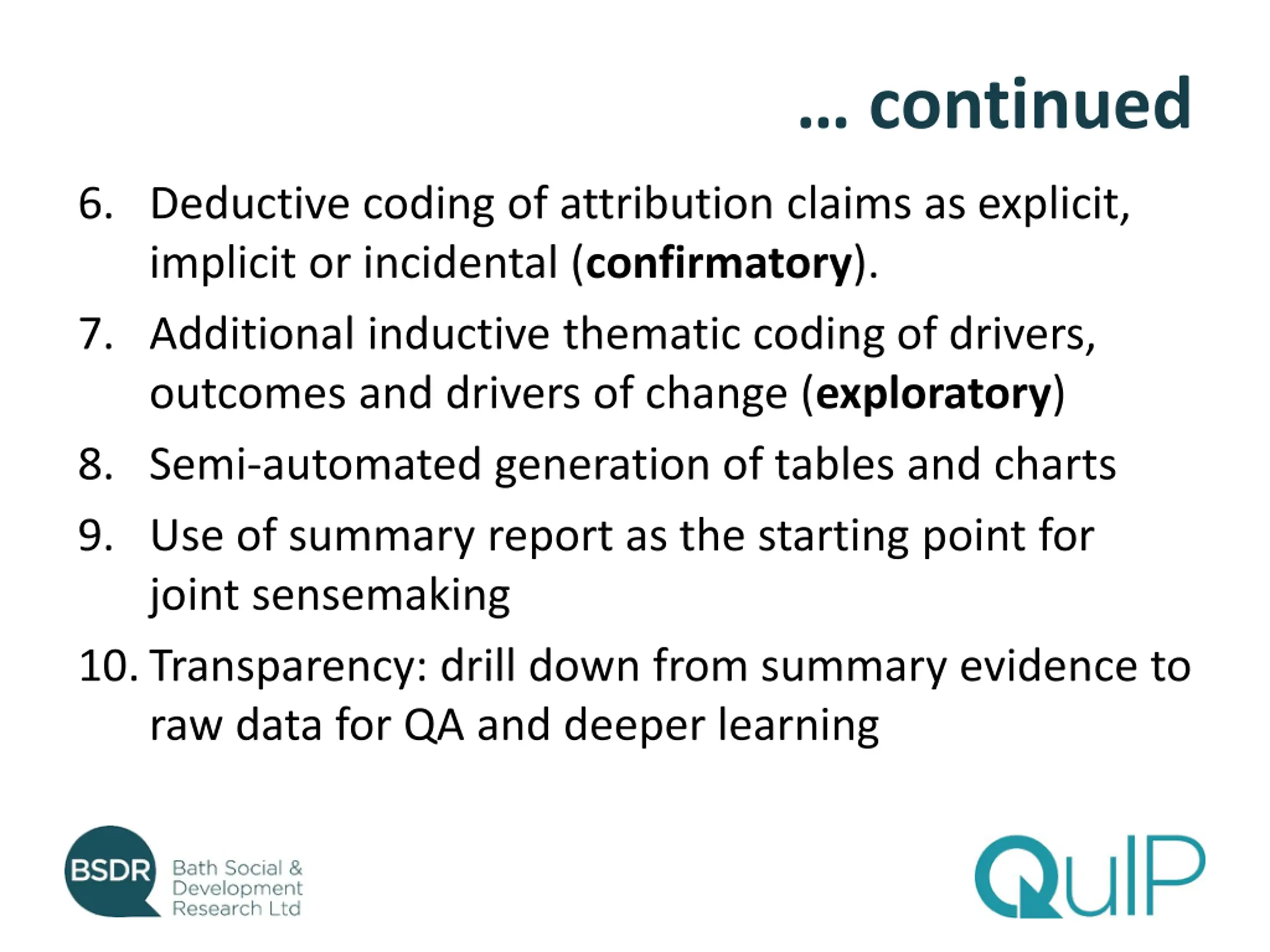 continued 6. Deductive coding of attribution claims as explicit, implicit or incidental (confirmatory). 7. Additional inductive thematic coding of drivers, outcomes and drivers of change (exploratory) 8. Semi-automated generation of tables and charts 9. Use of summary report as the starting point for joint sensemaking 10.Transparency: drill down from summary evidence to raw data for QA and deeper learning
