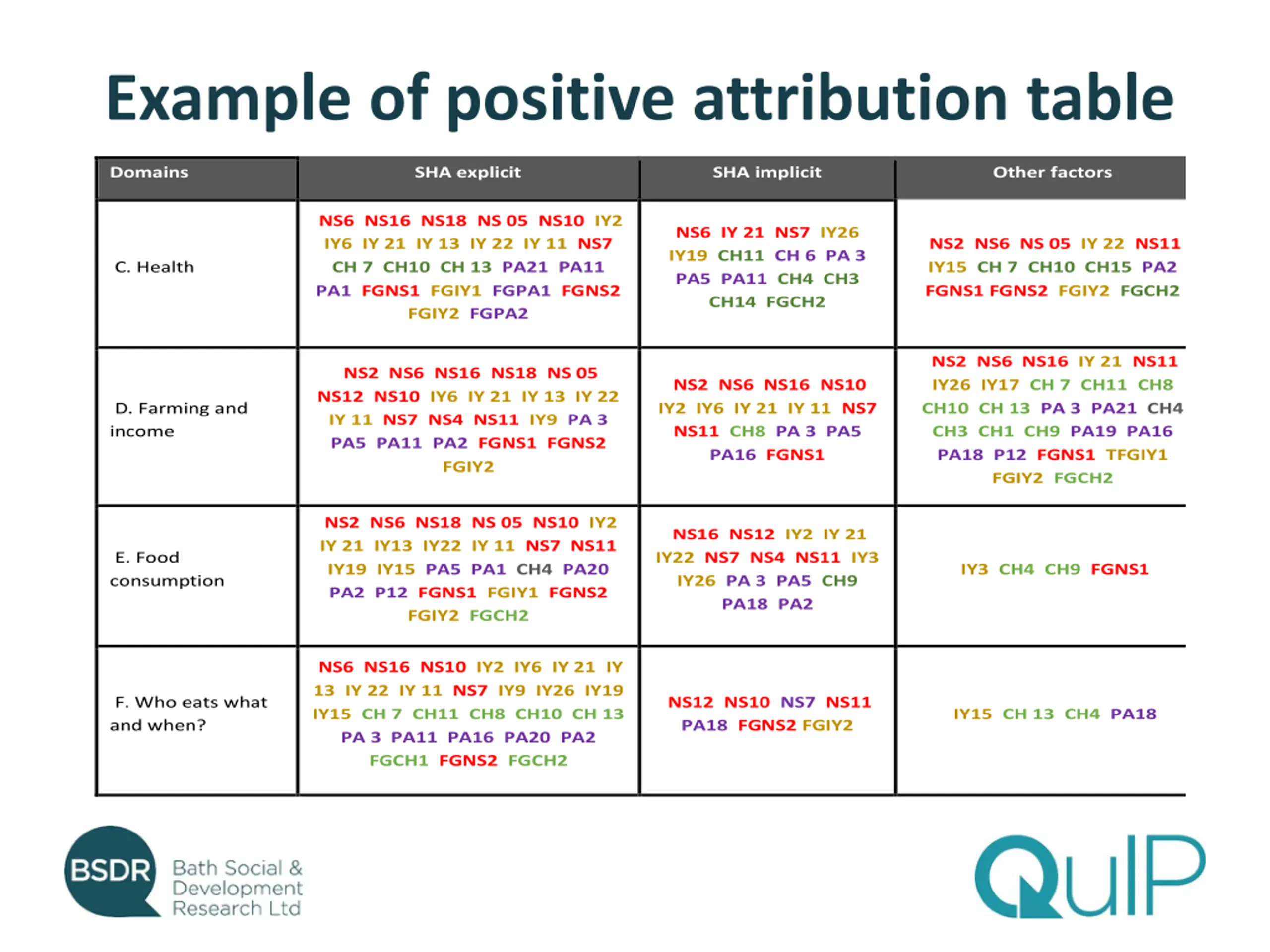 Example of positive attribution table Domains SHA explicit SHA implicit Other factors NS6 NS16 NS18 NS 05 NS10 IY2 IY6 IY 21 IY 13 IY 22 IY 11 NS7 CH 7 CH10 CH 13 PA21 PA11 PA1 FGNS1 FGIY1 FGPA1 FGNS2 FGIY2 FGPA2 NS6 IY 21 NS7 IY26 IY19 CH11 CH 6 PA 3 PA5 PA11 CH4 CH3 CH14 FGCH2 NS2 NS6 NS 05 IY 22 NS11 IY15 CH 7 CH10 CH15 PA2 FGNS1 FGNS2 FGIY2 FGCH2 C. Health NS2 NS6 NS16 IY 21 NS11 IY26 IY17 CH 7 CH11 CH8 CH10 CH 13 PA 3 PA21 CH4 CH3 CH1 CH9 PA19 PA16 PA18 P12 FGNS1 TFGIY1 FGIY2 FGCH2 NS2 NS6 NS16 NS18 NS 05 NS12 NS10 IY6 IY 21 IY 13 IY 22 IY 11 NS7 NS4 NS11 IY9 PA 3 PA5 PA11 PA2 FGNS1 FGNS2 FGIY2 NS2 NS6 NS16 NS10 IY2 IY6 IY 21 IY 11 NS7 NS11 CH8 PA 3 PA5 PA16 FGNS1 D. Farming and income NS2 NS6 NS18 NS 05 NS10 IY2 IY 21 IY13 IY22 IY 11 NS7 NS11 IY19 IY15 PA5 PA1 CH4 PA20 PA2 P12 FGNS1 FGIY1 FGNS2 FGIY2 FGCH2 NS16 NS12 IY2 IY 21 IY22 NS7 NS4 NS11 IY3 IY26 PA 3 PA5 CH9 PA18 PA2 E. Food consumption IY3 CH4 CH9 FGNS1 NS6 NS16 NS10 IY2 IY6 IY 21 IY 13 IY 22 IY 11 NS7 IY9 IY26 IY19 IY15 CH 7 CH11 CH8 CH10 CH 13 PA 3 PA11 PA16 PA20 PA2 FGCH1 FGNS2 FGCH2 F. Who eats what and when? NS12 NS10 NS7 NS11 PA18 FGNS2 FGIY2 IY15 CH 13 CH4 PA18