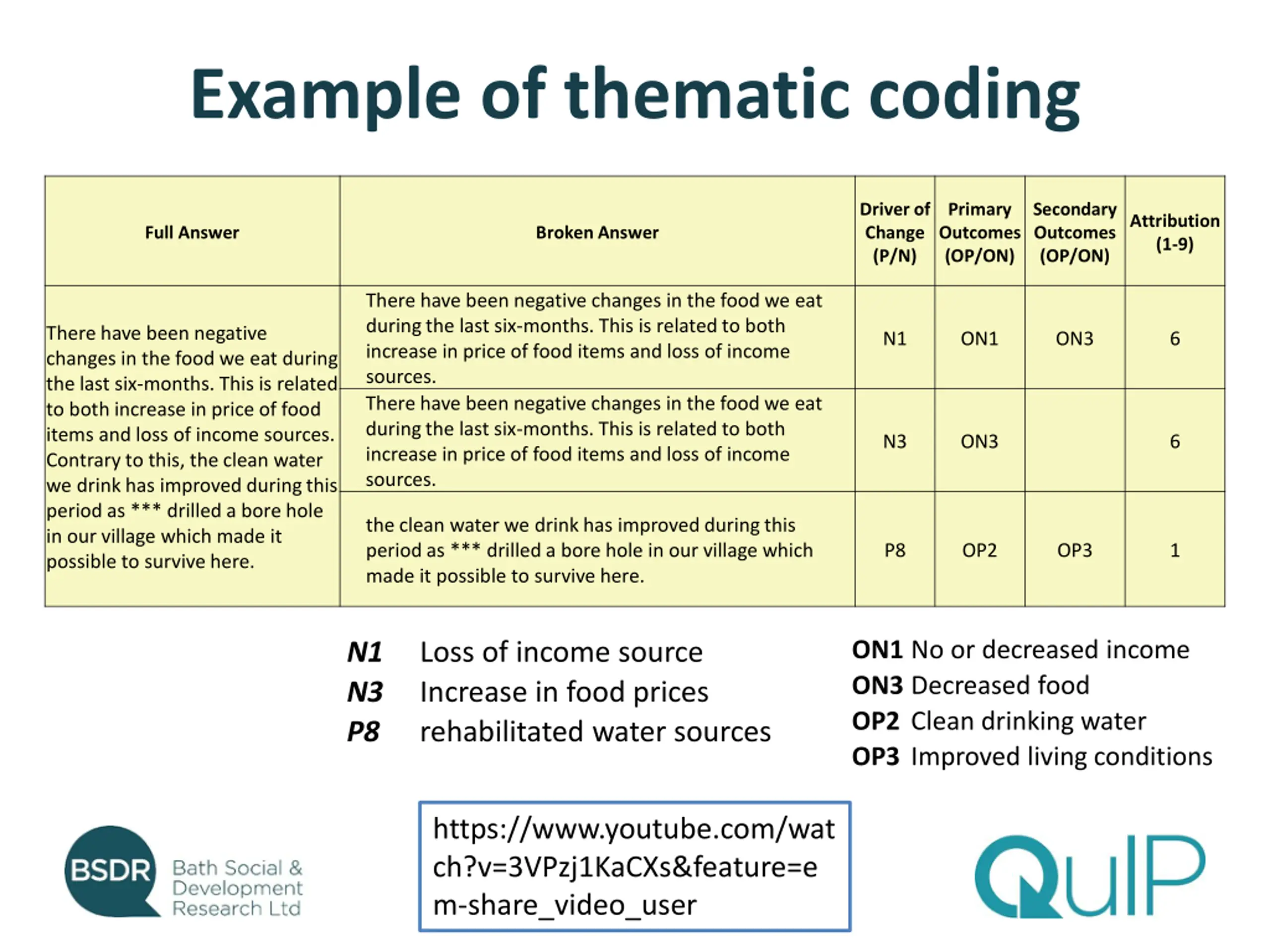 Example of thematic coding Driver of Change (P/N) Primary Outcomes (OP/ON) Secondary Outcomes (OP/ON) Attribution (1-9) Full Answer Broken Answer There have been negative changes in the food we eat during the last six-months. This is related to both increase in price of food items and loss of income sources. There have been negative changes in the food we eat during the last six-months. This is related to both increase in price of food items and loss of income sources. There have been negative changes in the food we eat during the last six-months. This is related to both increase in price of food items and loss of income sources. Contrary to this, the clean water we drink has improved during this period as *** drilled a bore hole in our village which made it possible to survive here. N1 ON1 ON3 6 N3 ON3 6 the clean water we drink has improved during this period as *** drilled a bore hole in our village which made it possible to survive here. P8 OP2 OP3 1 ON1 No or decreased income ON3 Decreased food OP2 Clean drinking water OP3 Improved living conditions N1 N3 P8 Loss of income source Increase in food prices rehabilitated water sources https://www.youtube.com/wat ch?v=3VPzj1KaCXs&feature=e m-share_video_user