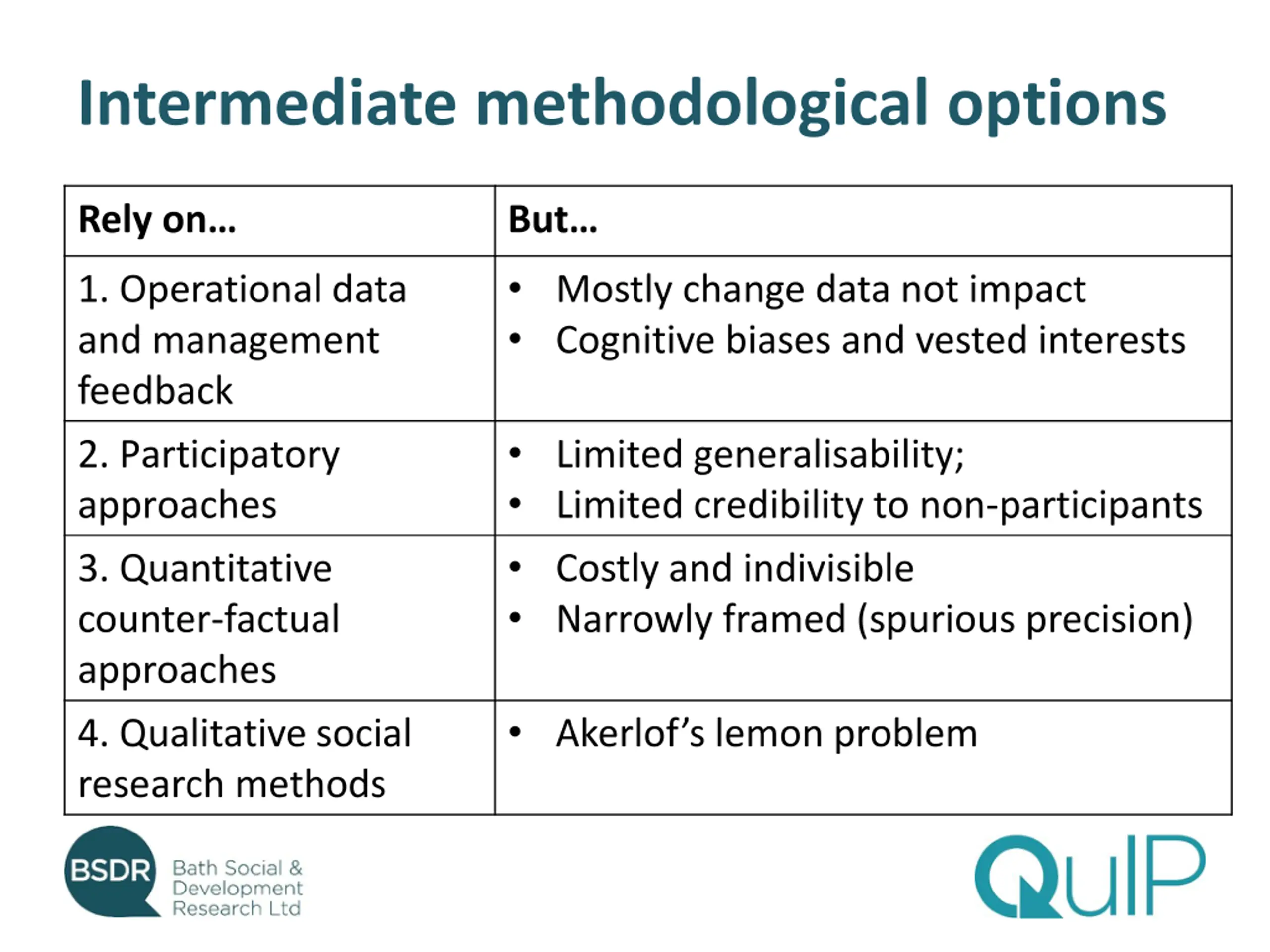 Intermediate methodological options Rely on But Mostly change data not impact Cognitive biases and vested interests 1. Operational data and management feedback Limited generalisability; Limited credibility to non-participants Costly and indivisible Narrowly framed (spurious precision) 2. Participatory approaches 3. Quantitative counter-factual approaches Akerlof s lemon problem 4. Qualitative social research methods