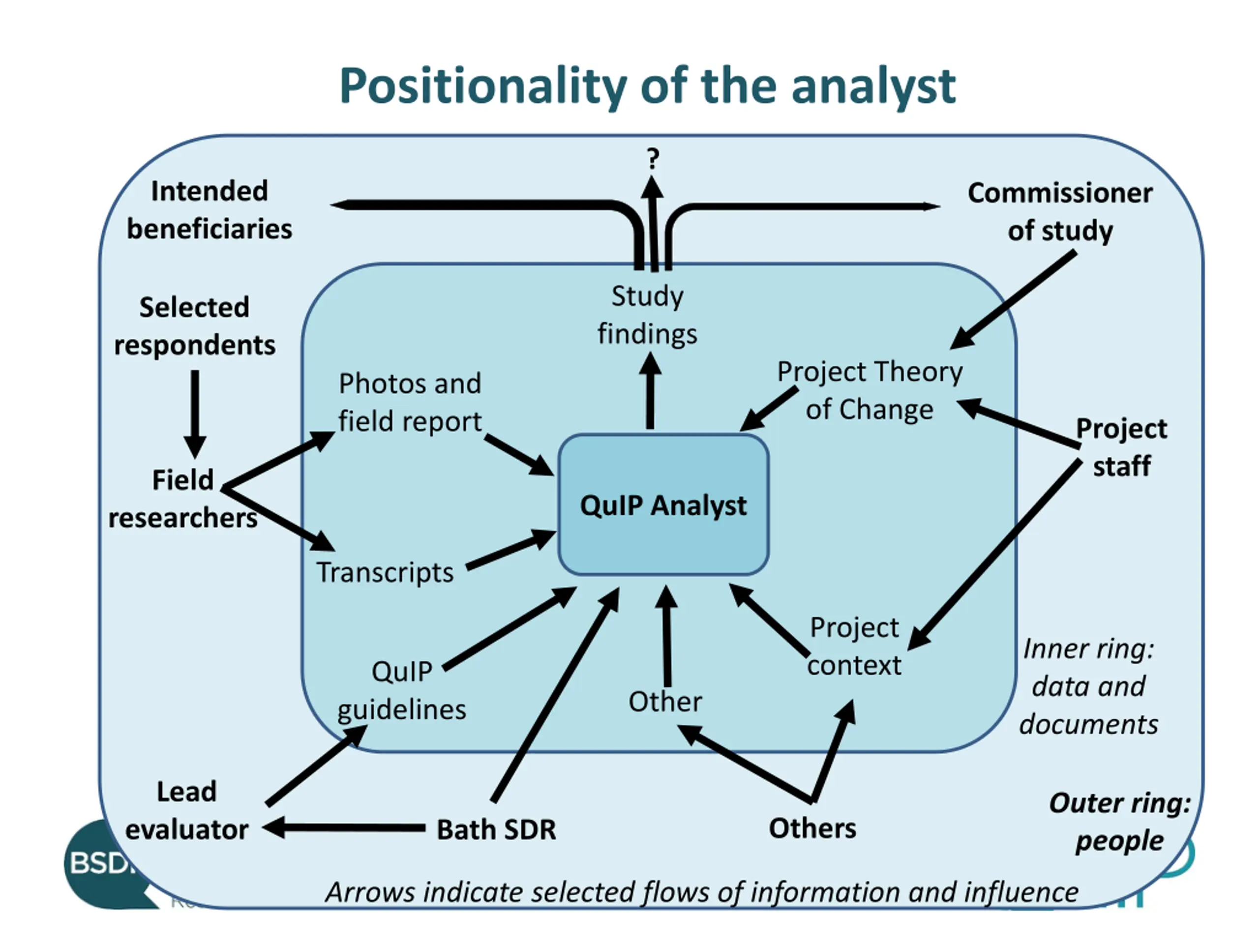 Positionality of the analyst ? Intended beneficiaries Commissioner of study Study findings Selected respondents Project Theory of Change Photos and field report Project staff Field QuIP Analyst researchers Transcripts Project context Inner ring: data and documents QuIP guidelines Other Lead evaluator Outer ring: people Others Bath SDR Arrows indicate selected flows of information and influence
