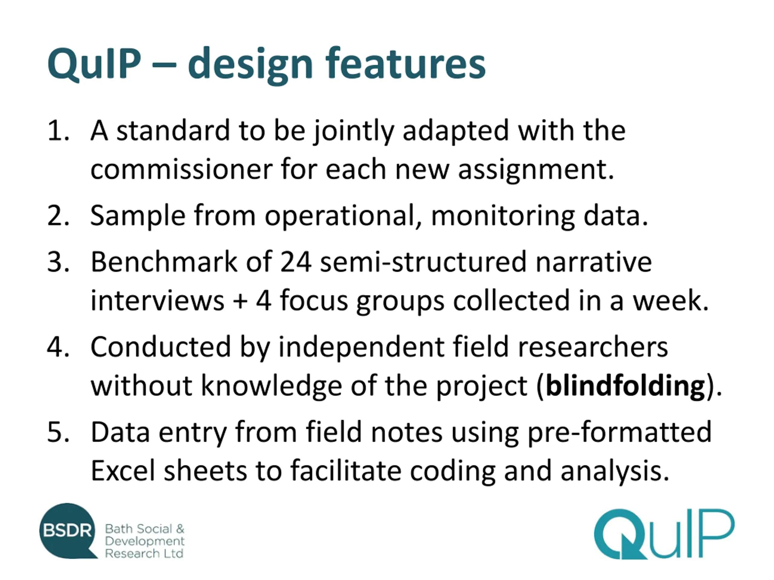 QuIP design features 1. A standard to be jointly adapted with the commissioner for each new assignment. 2. Sample from operational, monitoring data. 3. Benchmark of 24 semi-structured narrative interviews + 4 focus groups collected in a week. 4. Conducted by independent field researchers without knowledge of the project (blindfolding). 5. Data entry from field notes using pre-formatted Excel sheets to facilitate coding and analysis.