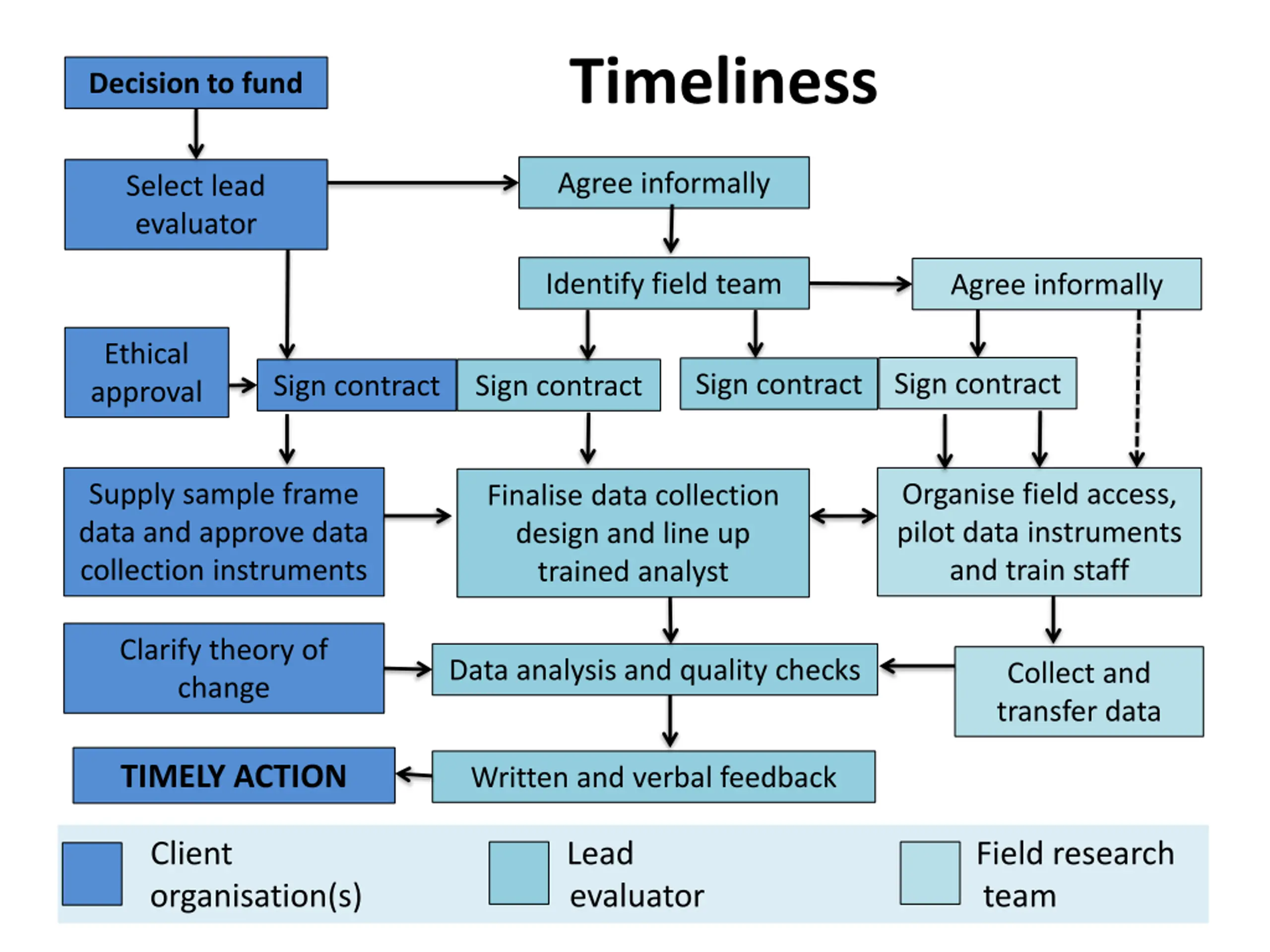 Timeliness Decision to fund Agree informally Select lead evaluator Identify field team Agree informally Ethical approval Sign contract Sign contract Sign contract Sign contract Supply sample frame data and approve data collection instruments Organise field access, pilot data instruments and train staff Finalise data collection design and line up trained analyst Clarify theory of change Data analysis and quality checks Collect and transfer data TIMELY ACTION Written and verbal feedback Client Lead Field research organisation(s) evaluator team