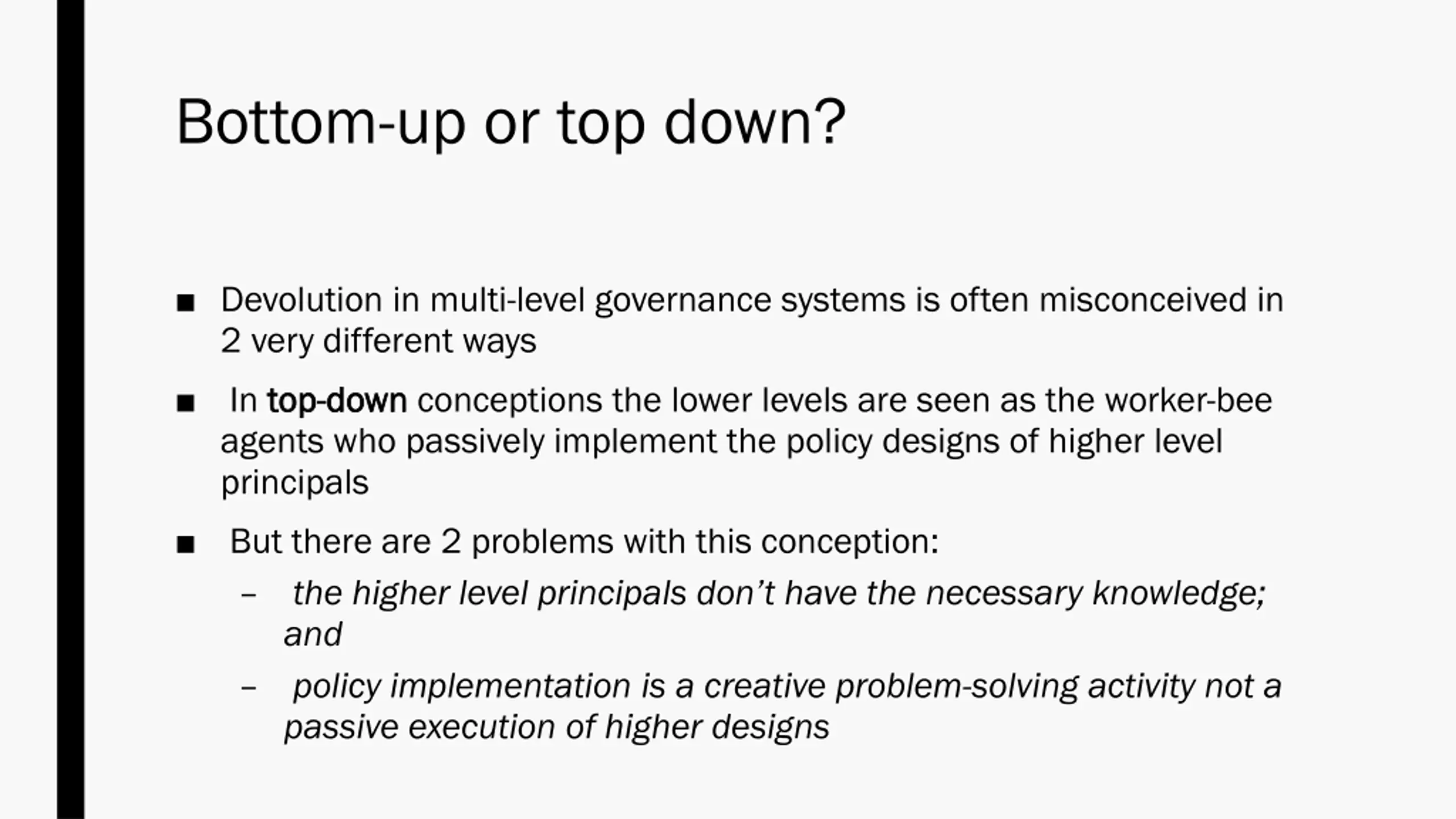 Bottom-up or top down? Devolution in multi-level governance systems is often misconceived in 2 very different ways In top top- -down down conceptions the lower levels are seen as the worker-bee agents who passively implement the policy designs of higher level principals But there are 2 problems with this conception: the higher level principals don t have the necessary knowledge; and policy implementation is a creative problem-solving activity not a passive execution of higher designs