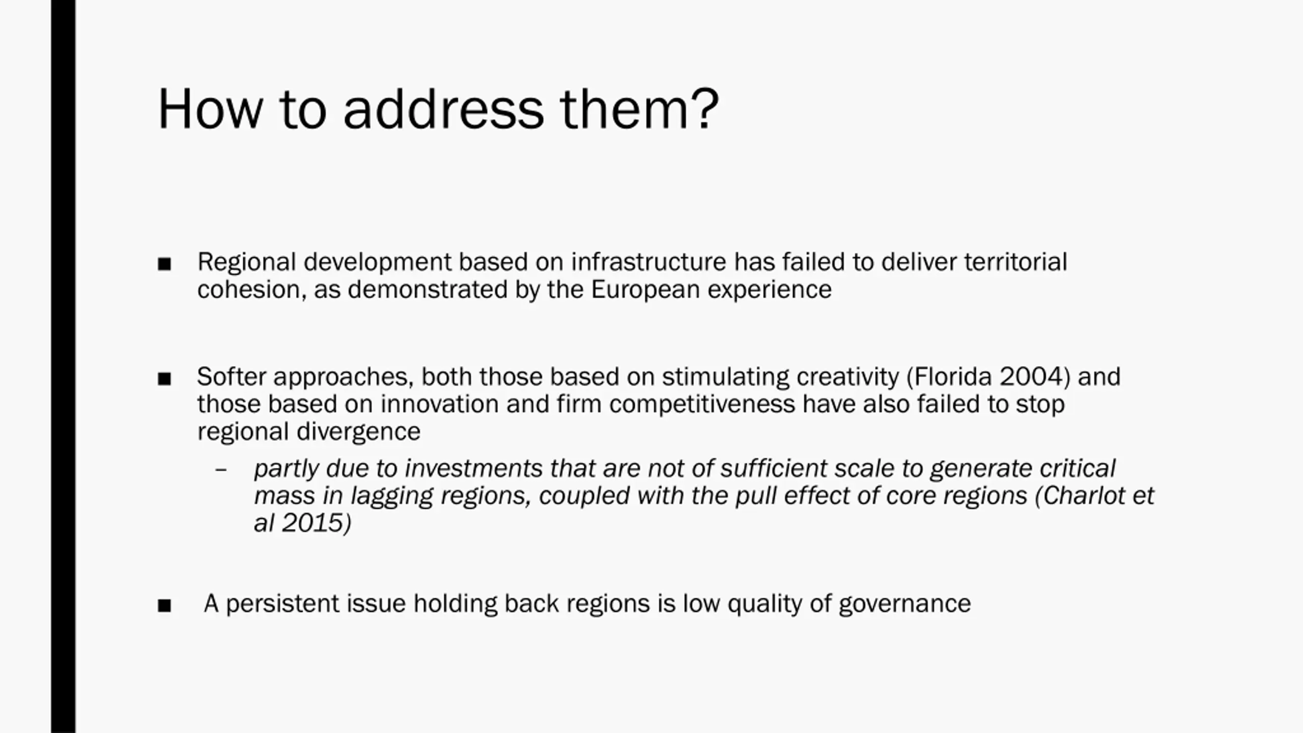 How to address them? Regional development based on infrastructure has failed to deliver territorial cohesion, as demonstrated by the European experience Softer approaches, both those based on stimulating creativity (Florida 2004) and those based on innovation and firm competitiveness have also failed to stop regional divergence partly due to investments that are not of sufficient scale to generate critical mass in lagging regions, coupled with the pull effect of core regions (Charlot et al 2015) A persistent issue holding back regions is low quality of governance