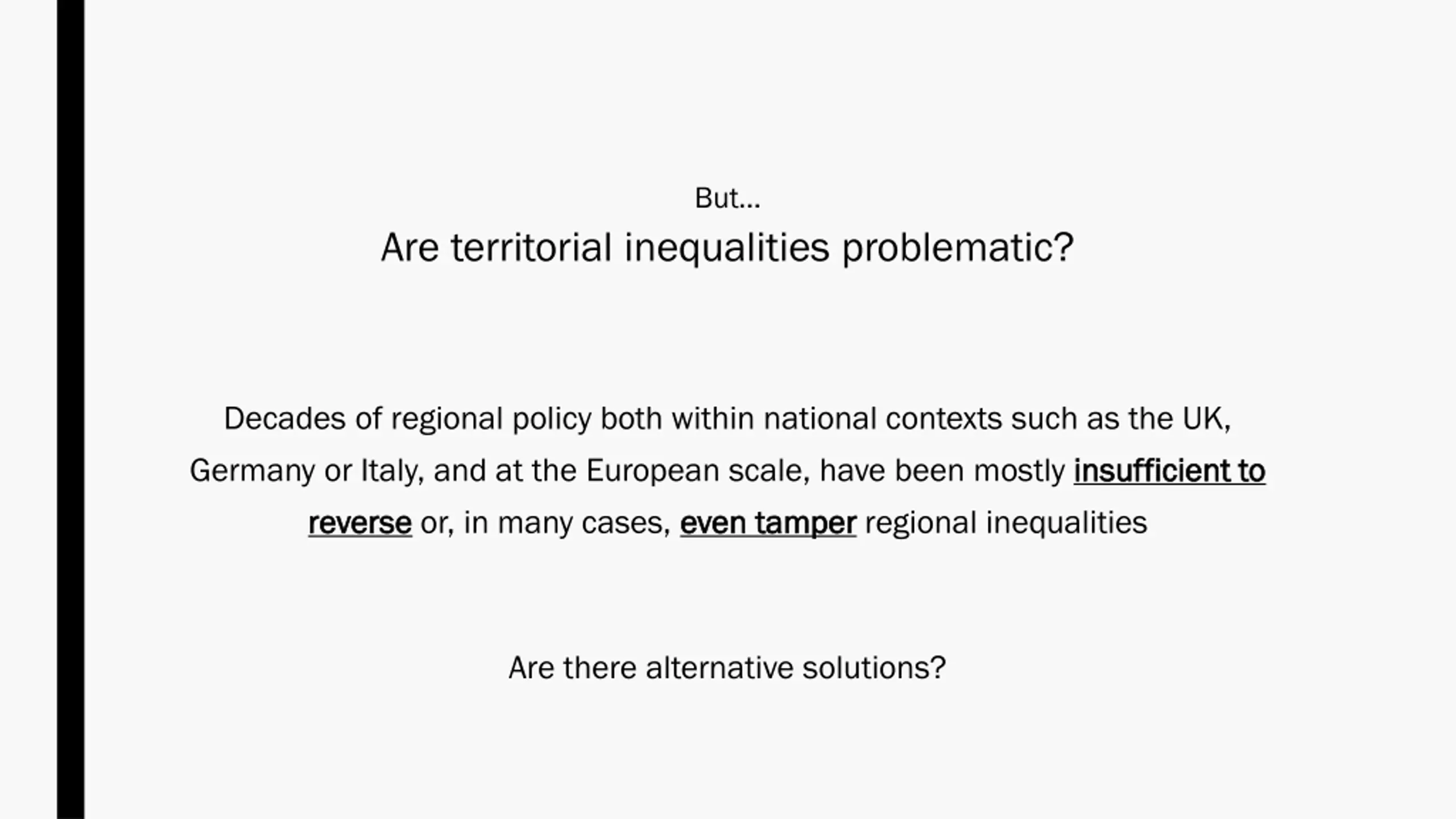 But Are territorial inequalities problematic? Decades of regional policy both within national contexts such as the UK, Germany or Italy, and at the European scale, have been mostly insufficient to reverse reverse or, in many cases, even tamper even tamper regional inequalities insufficient to Are there alternative solutions?