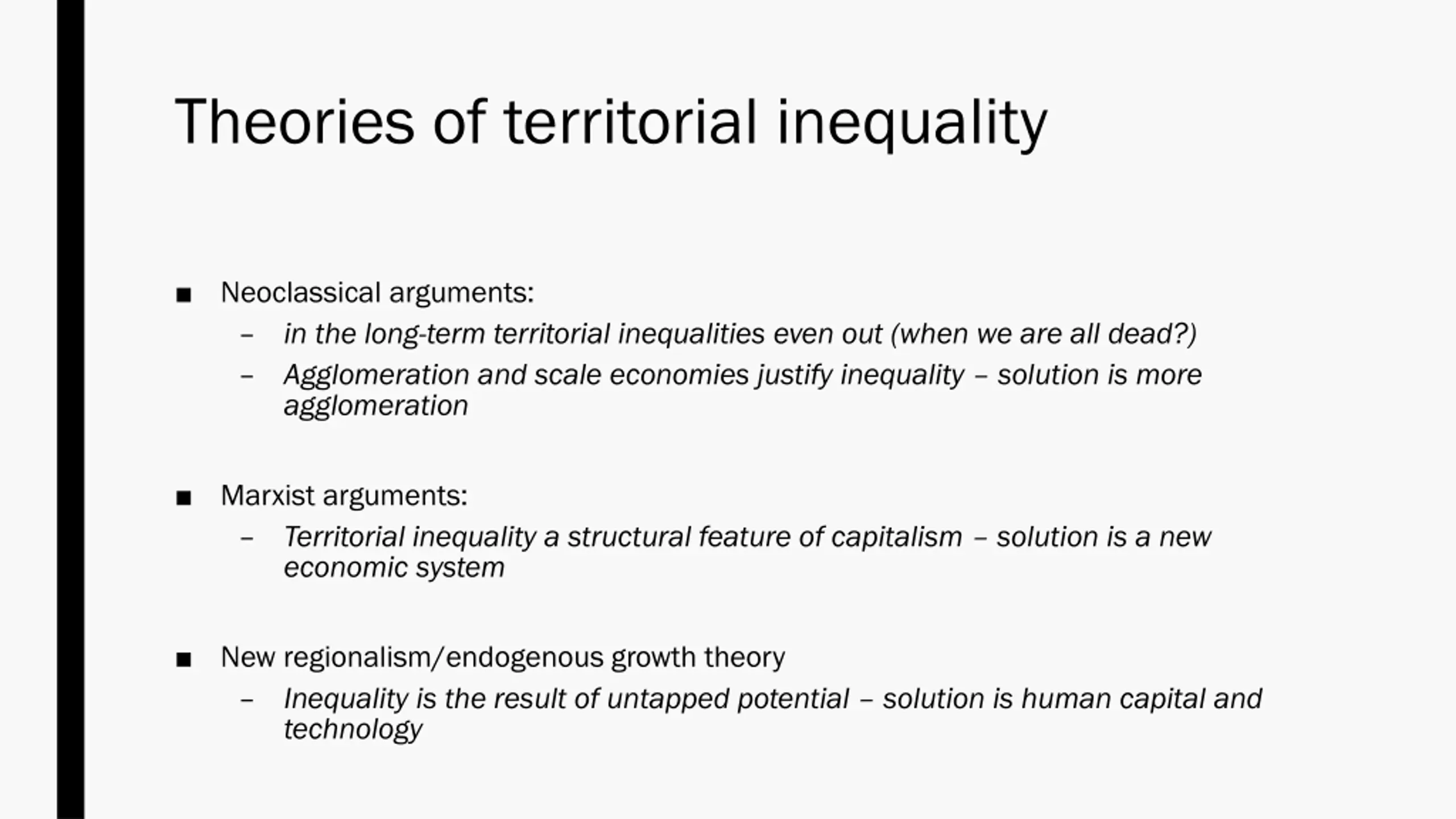 Theories of territorial inequality Neoclassical arguments: in the long-term territorial inequalities even out (when we are all dead?) Agglomeration and scale economies justify inequality solution is more agglomeration Marxist arguments: Territorial inequality a structural feature of capitalism solution is a new economic system New regionalism/endogenous growth theory Inequality is the result of untapped potential solution is human capital and technology