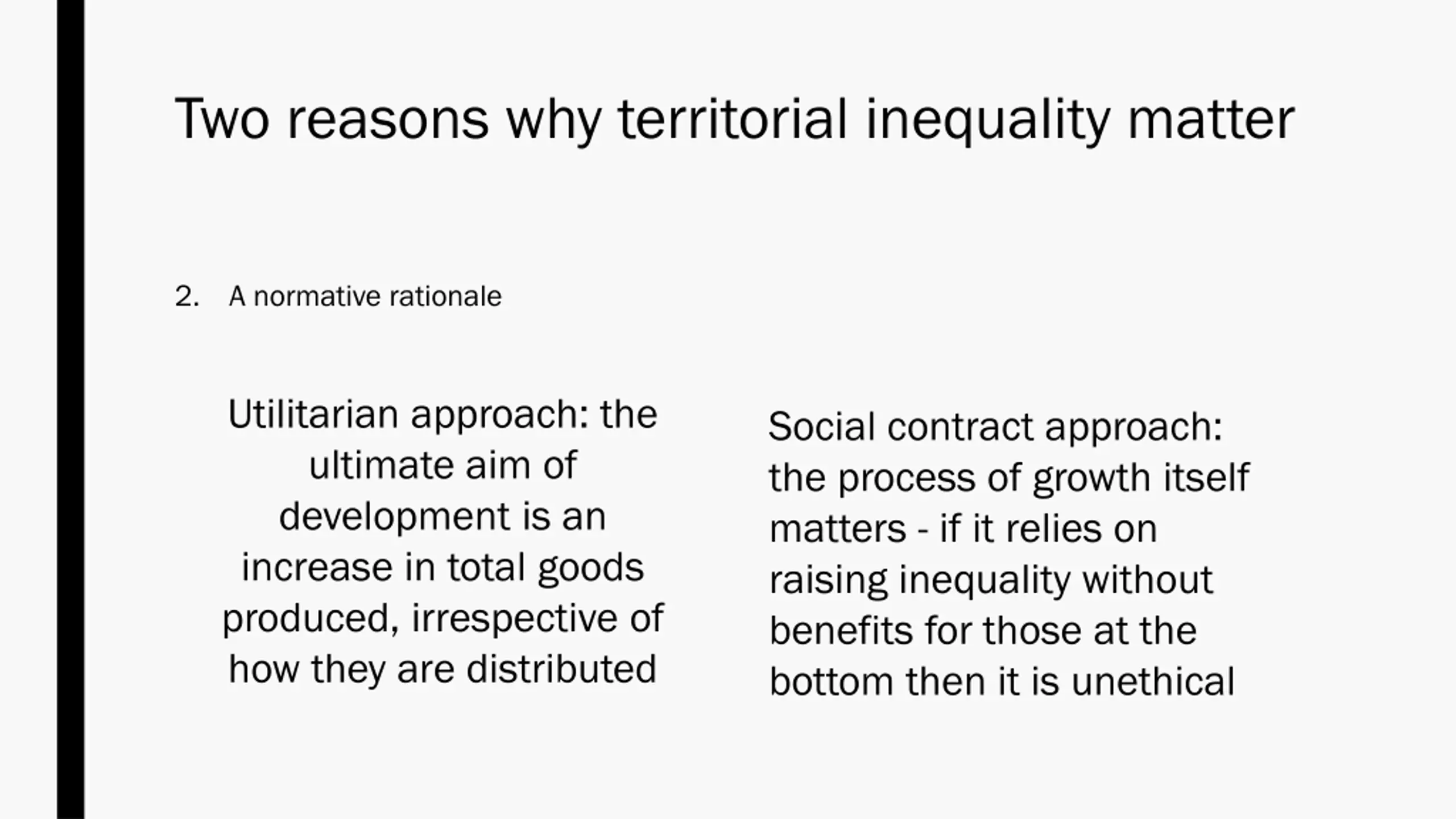 Two reasons why territorial inequality matter 2. A normative rationale Utilitarian approach: the ultimate aim of development is an increase in total goods produced, irrespective of how they are distributed Social contract approach: the process of growth itself matters - if it relies on raising inequality without benefits for those at the bottom then it is unethical