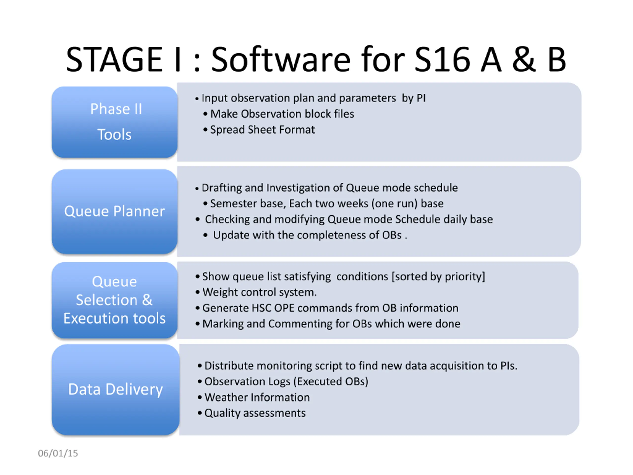 STAGE I : Software for S16 A & B Input observation plan and parameters by PI Make Observation block files Spread Sheet Format Phase II Tools Drafting and Investigation of Queue mode schedule Semester base, Each two weeks (one run) base Checking and modifying Queue mode Schedule daily base Update with the completeness of OBs . Queue Planner Show queue list satisfying conditions [sorted by priority] Weight control system. Generate HSC OPE commands from OB information Marking and Commenting for OBs which were done Queue Selection & Execution tools Distribute monitoring script to find new data acquisition to PIs. Observation Logs (Executed OBs) Weather Information Quality assessments Data Delivery 06/01/15