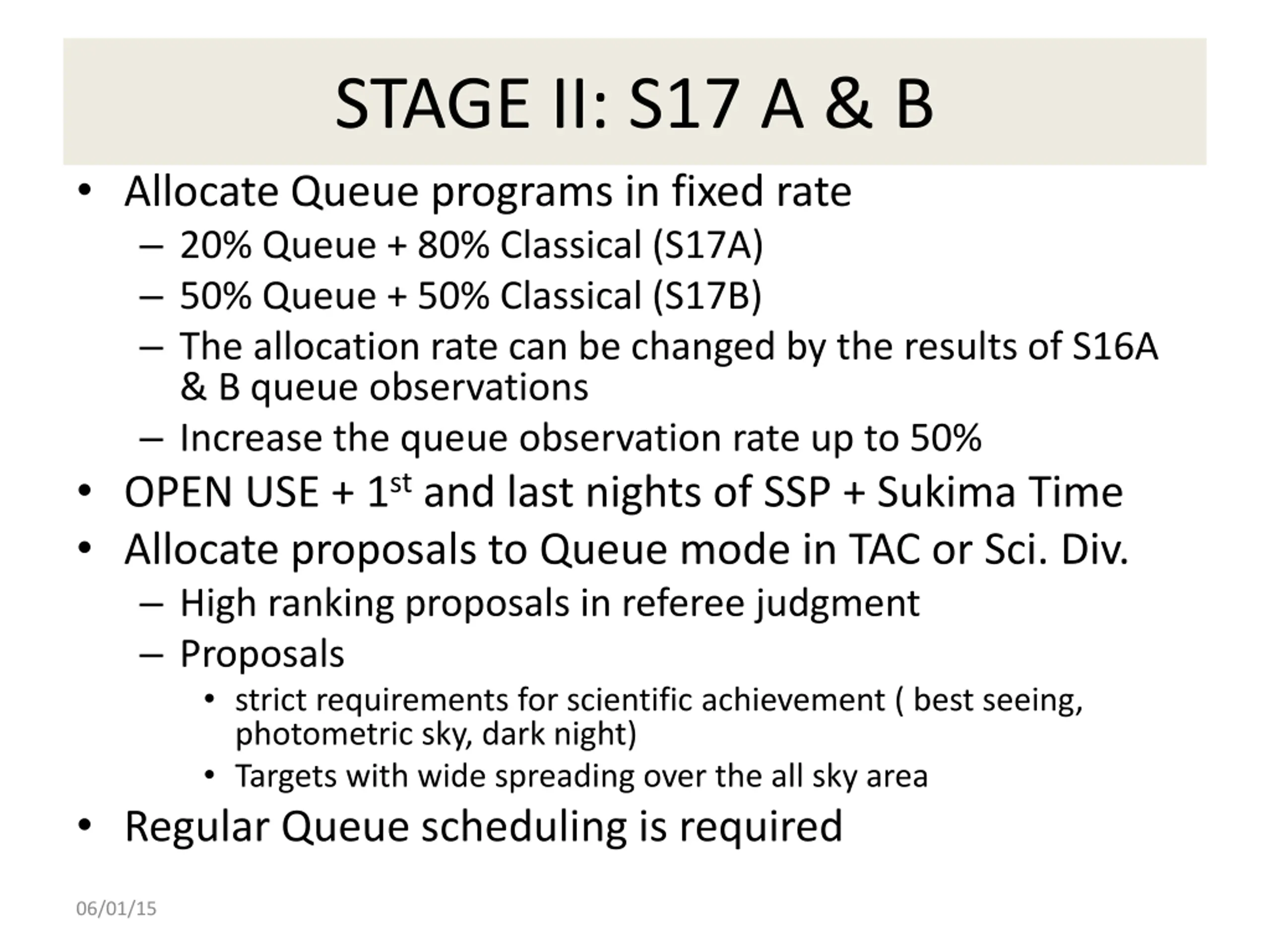 STAGE II: S17 A & B Allocate Queue programs in fixed rate 20% Queue + 80% Classical (S17A) 50% Queue + 50% Classical (S17B) The allocation rate can be changed by the results of S16A & B queue observations Increase the queue observation rate up to 50% OPEN USE + 1st and last nights of SSP + Sukima Time Allocate proposals to Queue mode in TAC or Sci. Div. High ranking proposals in referee judgment Proposals strict requirements for scientific achievement ( best seeing, photometric sky, dark night) Targets with wide spreading over the all sky area Regular Queue scheduling is required 06/01/15