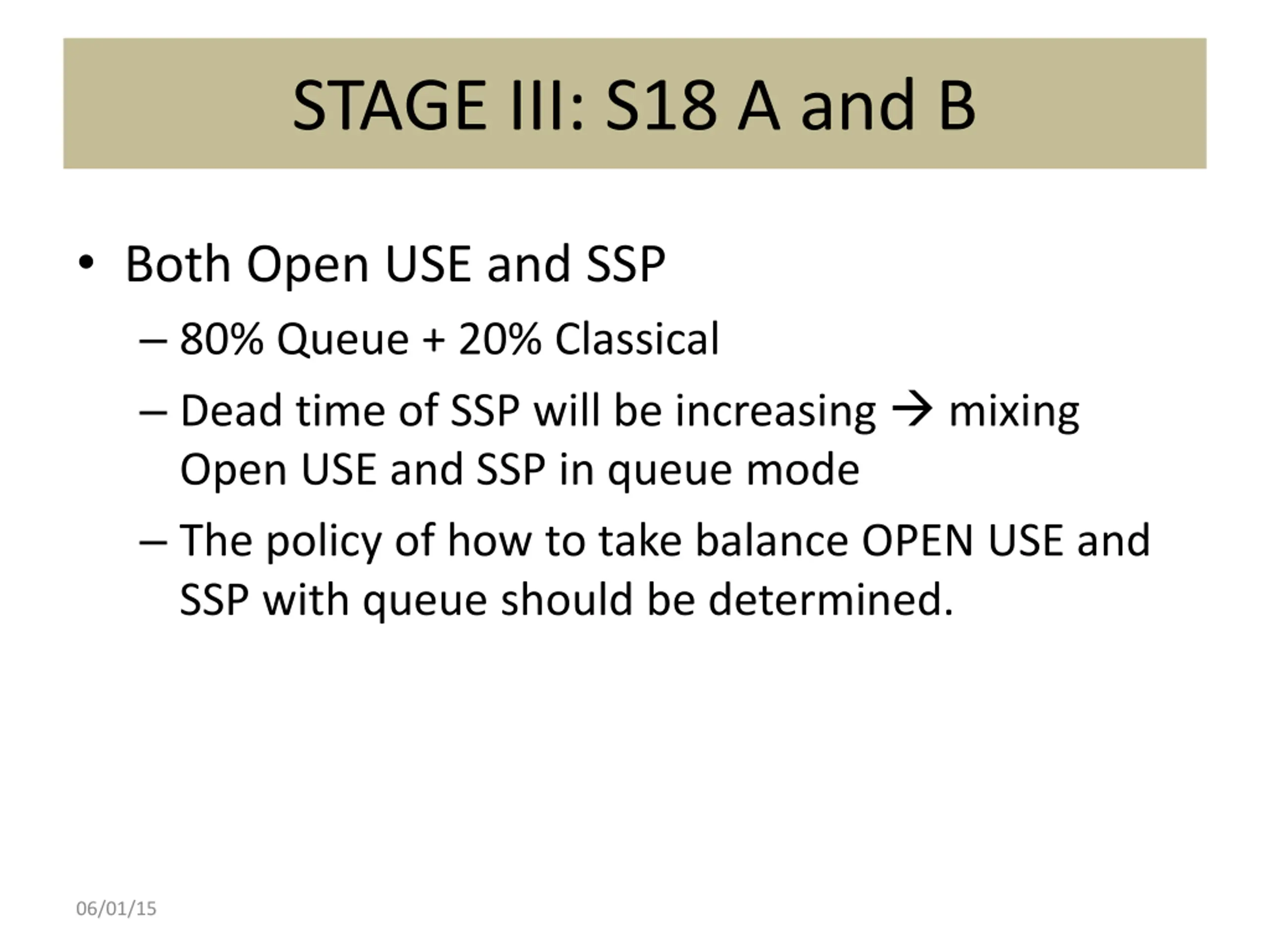 STAGE III: S18 A and B Both Open USE and SSP 80% Queue + 20% Classical Dead time of SSP will be increasing mixing Open USE and SSP in queue mode The policy of how to take balance OPEN USE and SSP with queue should be determined. 06/01/15