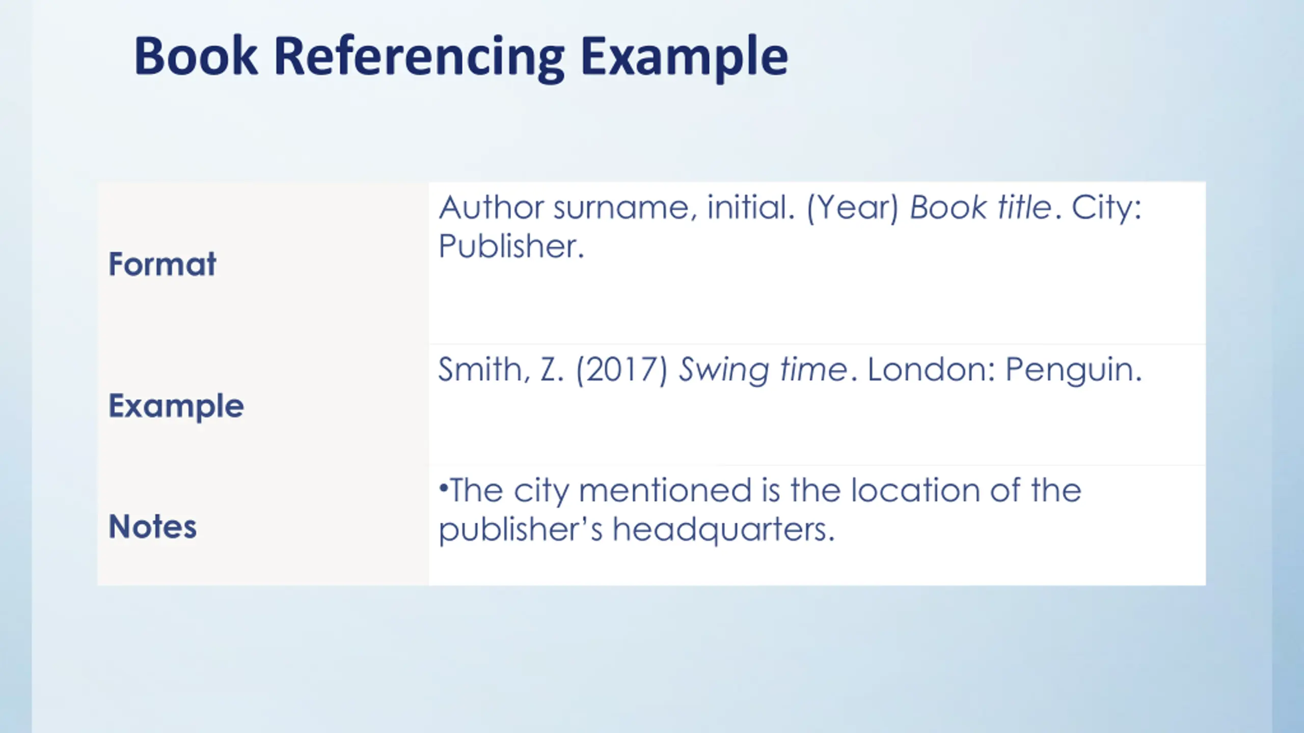 Book Referencing Example Author surname, initial. (Year) Book title. City: Publisher. Format Smith, Z. (2017) Swing time. London: Penguin. Example The city mentioned is the location of the publisher s headquarters. Notes