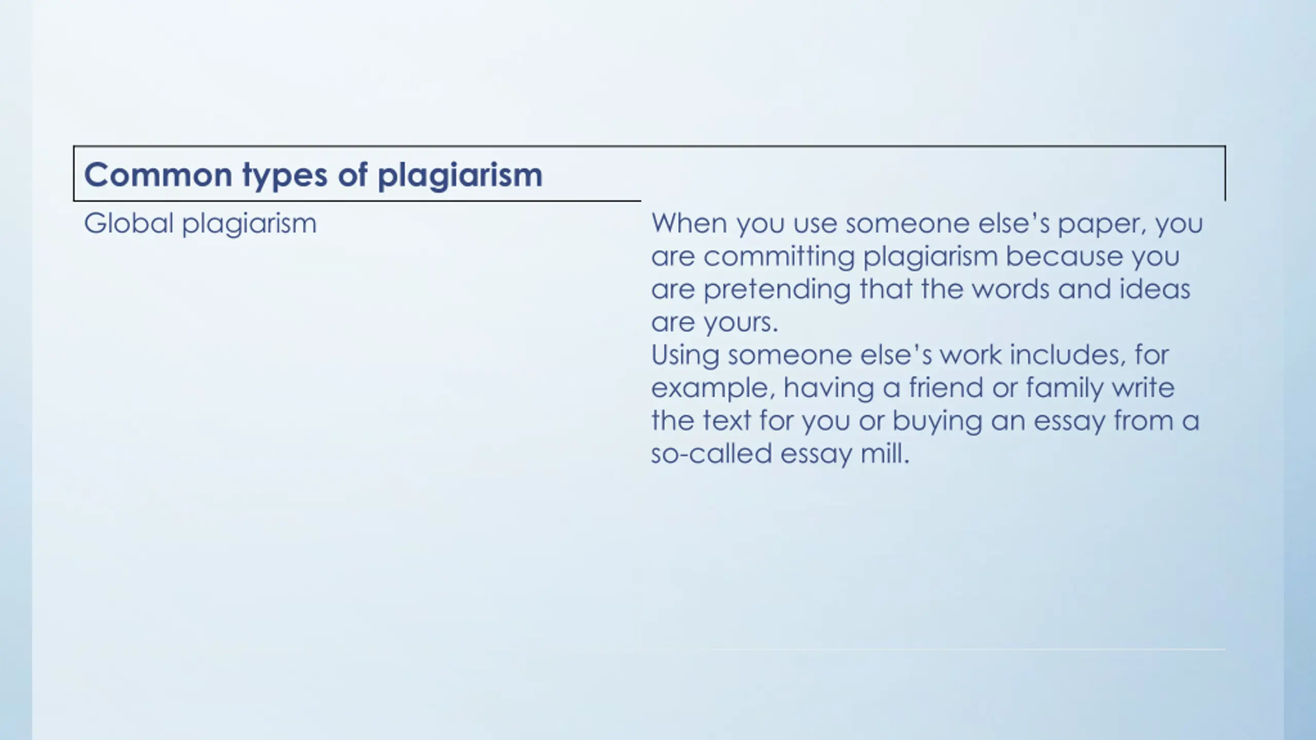 Common types of plagiarism Global plagiarism When you use someone else s paper, you are committing plagiarism because you are pretending that the words and ideas are yours. Using someone else s work includes, for example, having a friend or family write the text for you or buying an essay from a so-called essay mill.