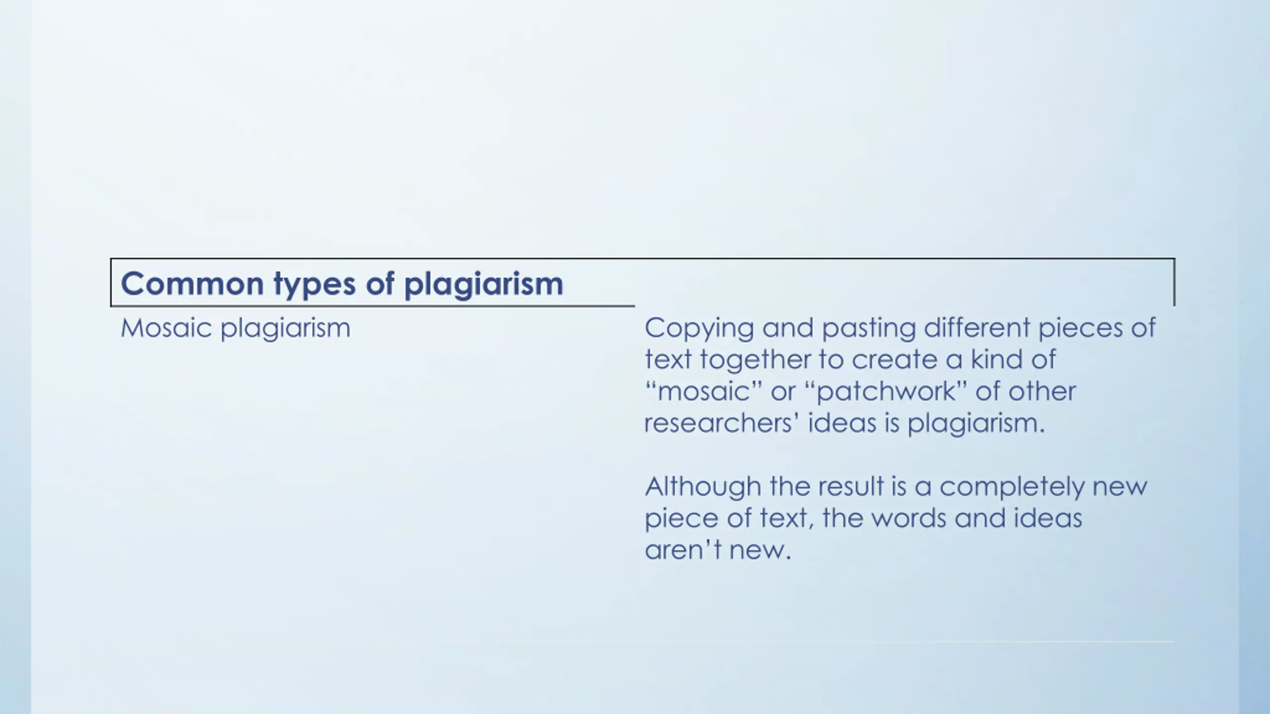 Common types of plagiarism Mosaic plagiarism Copying and pasting different pieces of text together to create a kind of mosaic or patchwork of other researchers ideas is plagiarism. Although the result is a completely new piece of text, the words and ideas aren t new.