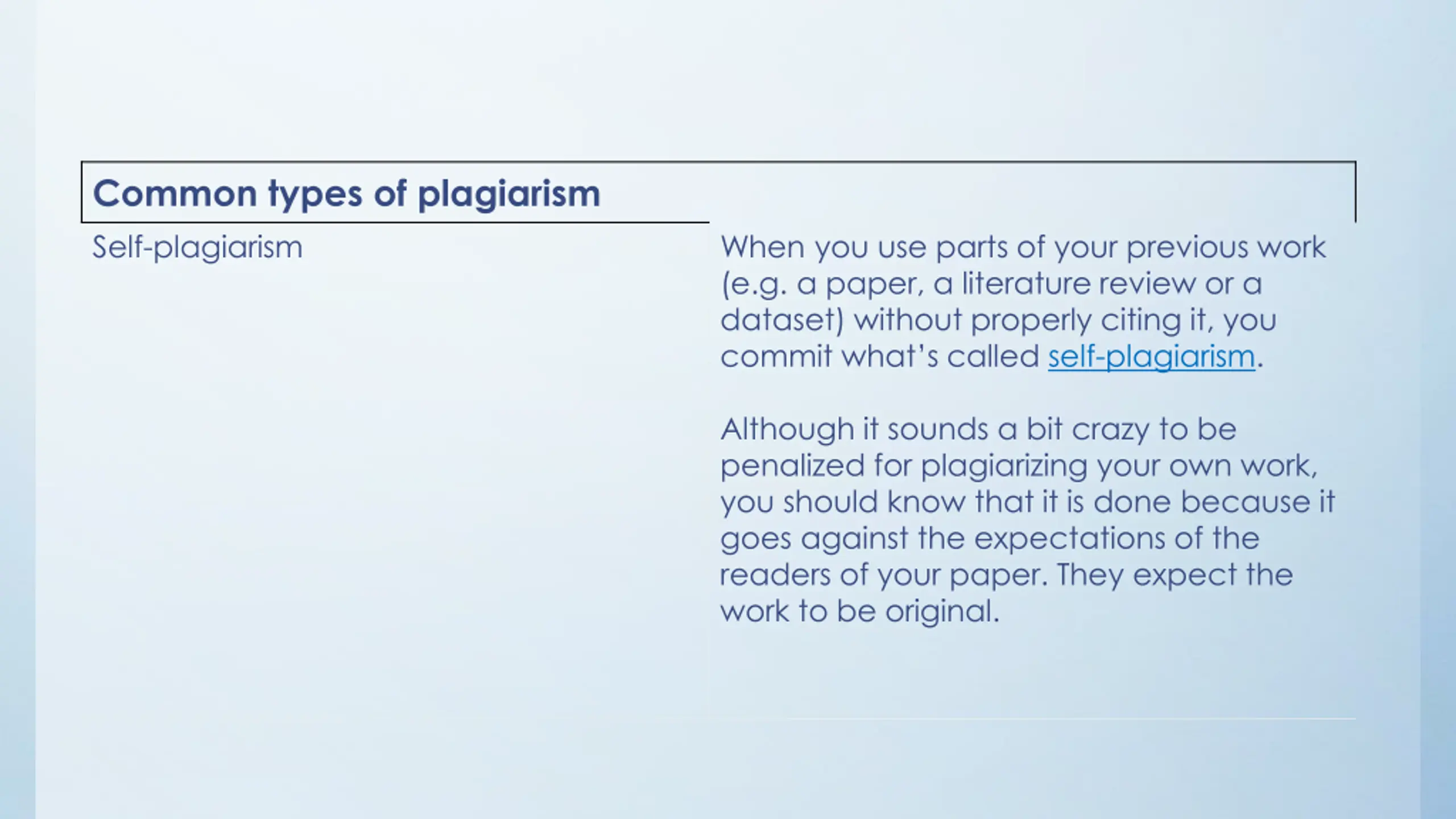 Common types of plagiarism Self-plagiarism When you use parts of your previous work (e.g. a paper, a literature review or a dataset) without properly citing it, you commit what s called self-plagiarism. Although it sounds a bit crazy to be penalized for plagiarizing your own work, you should know that it is done because it goes against the expectations of the readers of your paper. They expect the work to be original.