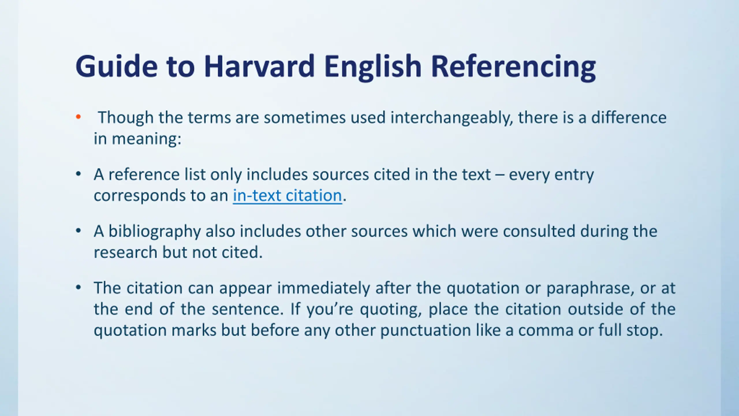 Guide to Harvard English Referencing Though the terms are sometimes used interchangeably, there is a difference in meaning: A reference list only includes sources cited in the text every entry corresponds to an in-text citation. A bibliography also includes other sources which were consulted during the research but not cited. The citation can appear immediately after the quotation or paraphrase, or at the end of the sentence. If you re quoting, place the citation outside of the quotation marks but before any other punctuation like a comma or full stop.