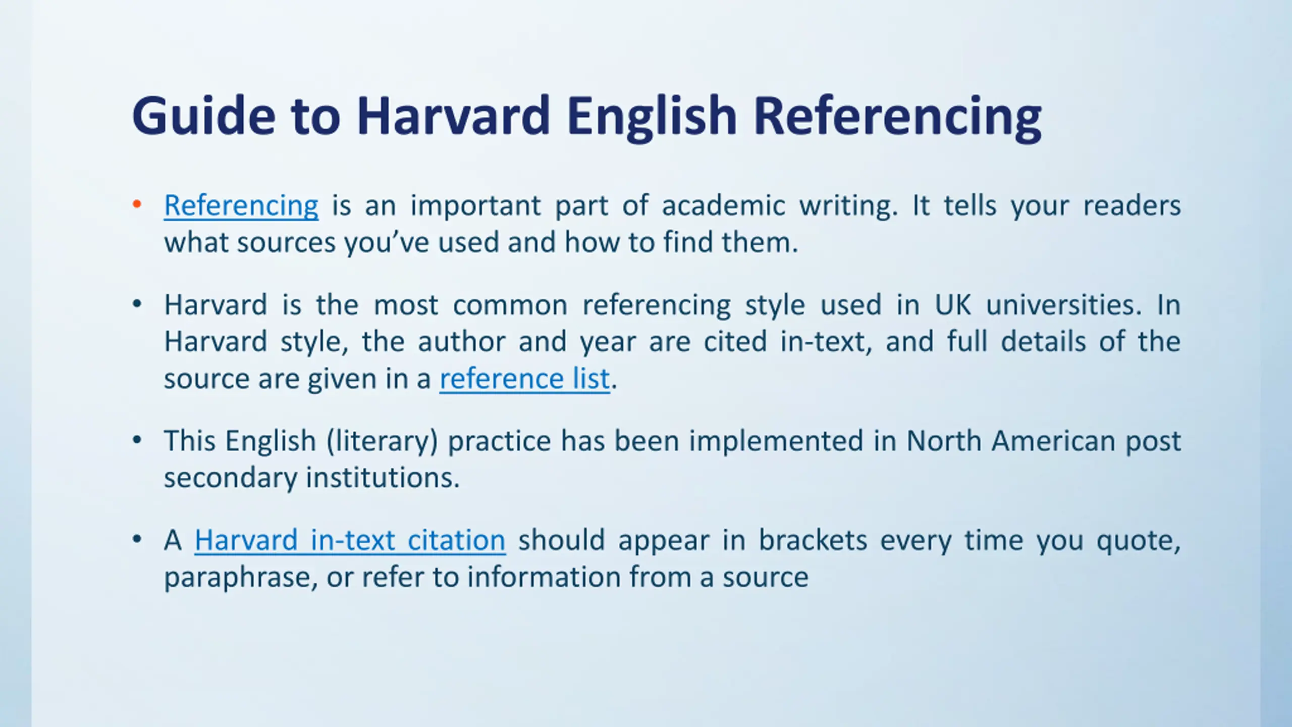 Guide to Harvard English Referencing Referencing is an important part of academic writing. It tells your readers what sources you ve used and how to find them. Harvard is the most common referencing style used in UK universities. In Harvard style, the author and year are cited in-text, and full details of the source are given in a reference list. This English (literary) practice has been implemented in North American post secondary institutions. A Harvard in-text citation should appear in brackets every time you quote, paraphrase, or refer to information from a source