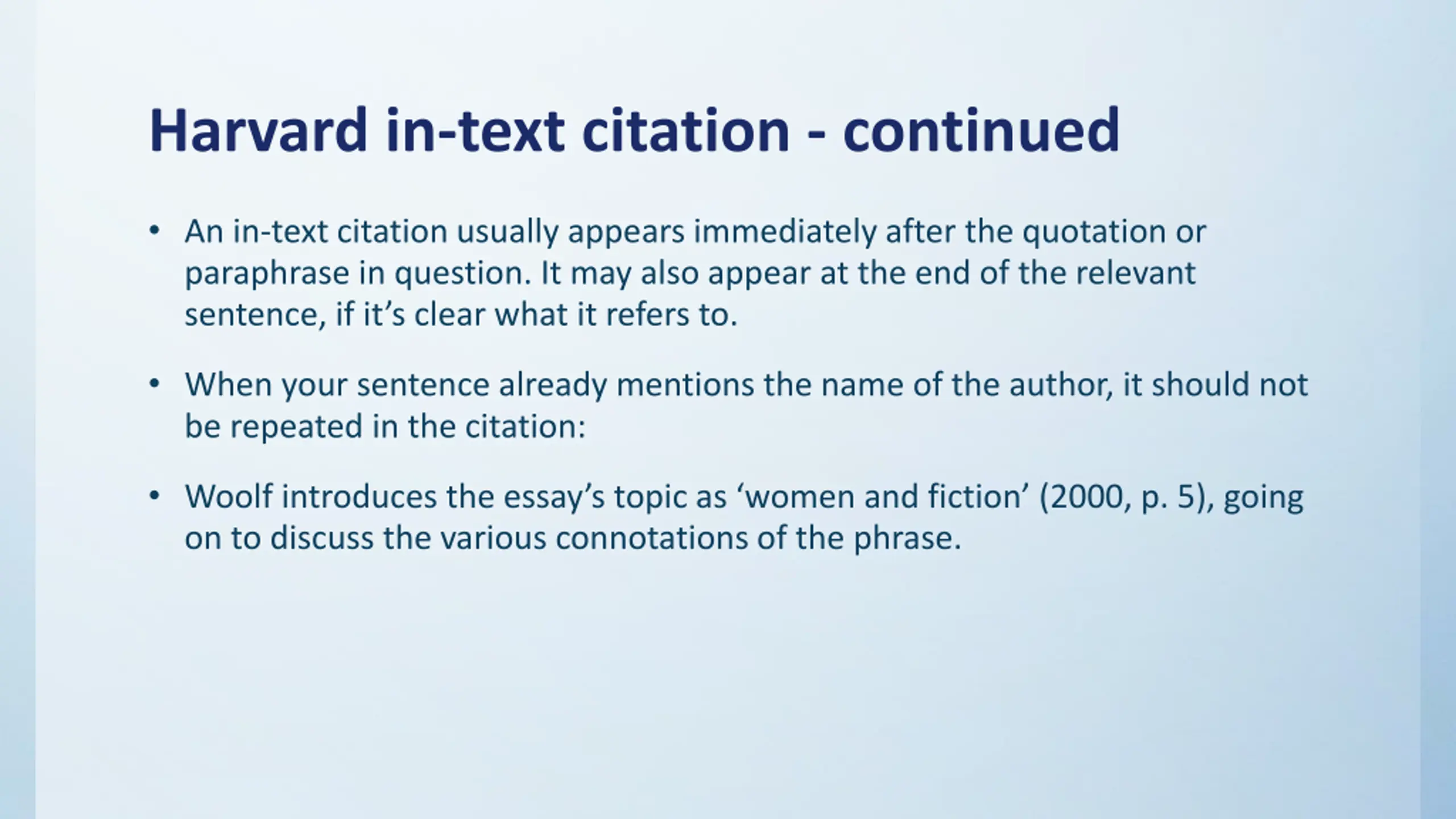 Harvard in-text citation - continued An in-text citation usually appears immediately after the quotation or paraphrase in question. It may also appear at the end of the relevant sentence, if it s clear what it refers to. When your sentence already mentions the name of the author, it should not be repeated in the citation: Woolf introduces the essay s topic as women and fiction (2000, p. 5), going on to discuss the various connotations of the phrase.
