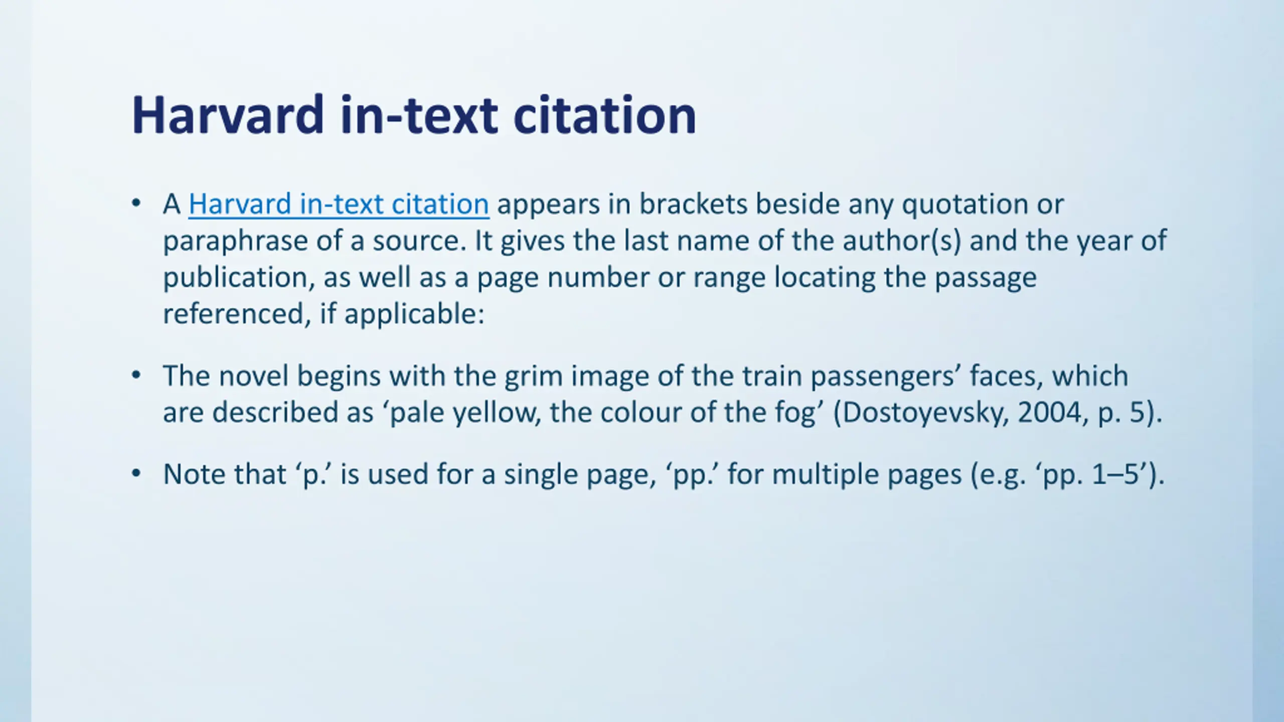 Harvard in-text citation A Harvard in-text citation appears in brackets beside any quotation or paraphrase of a source. It gives the last name of the author(s) and the year of publication, as well as a page number or range locating the passage referenced, if applicable: The novel begins with the grim image of the train passengers faces, which are described as pale yellow, the colour of the fog (Dostoyevsky, 2004, p. 5). Note that p. is used for a single page, pp. for multiple pages (e.g. pp. 1 5 ).