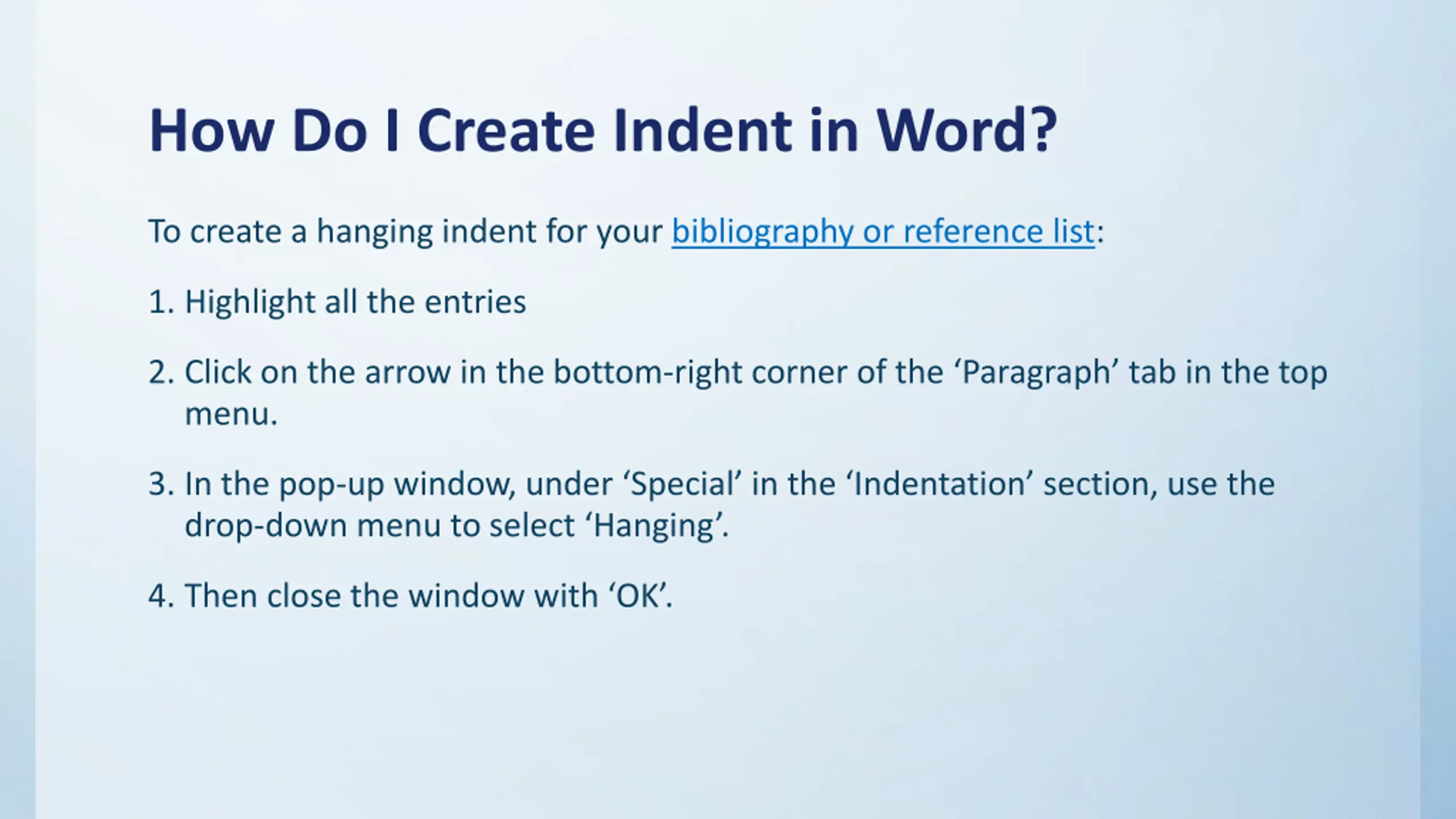 How Do I Create Indent in Word? To create a hanging indent for your bibliography or reference list: 1. Highlight all the entries 2. Click on the arrow in the bottom-right corner of the Paragraph tab in the top menu. 3. In the pop-up window, under Special in the Indentation section, use the drop-down menu to select Hanging . 4. Then close the window with OK .