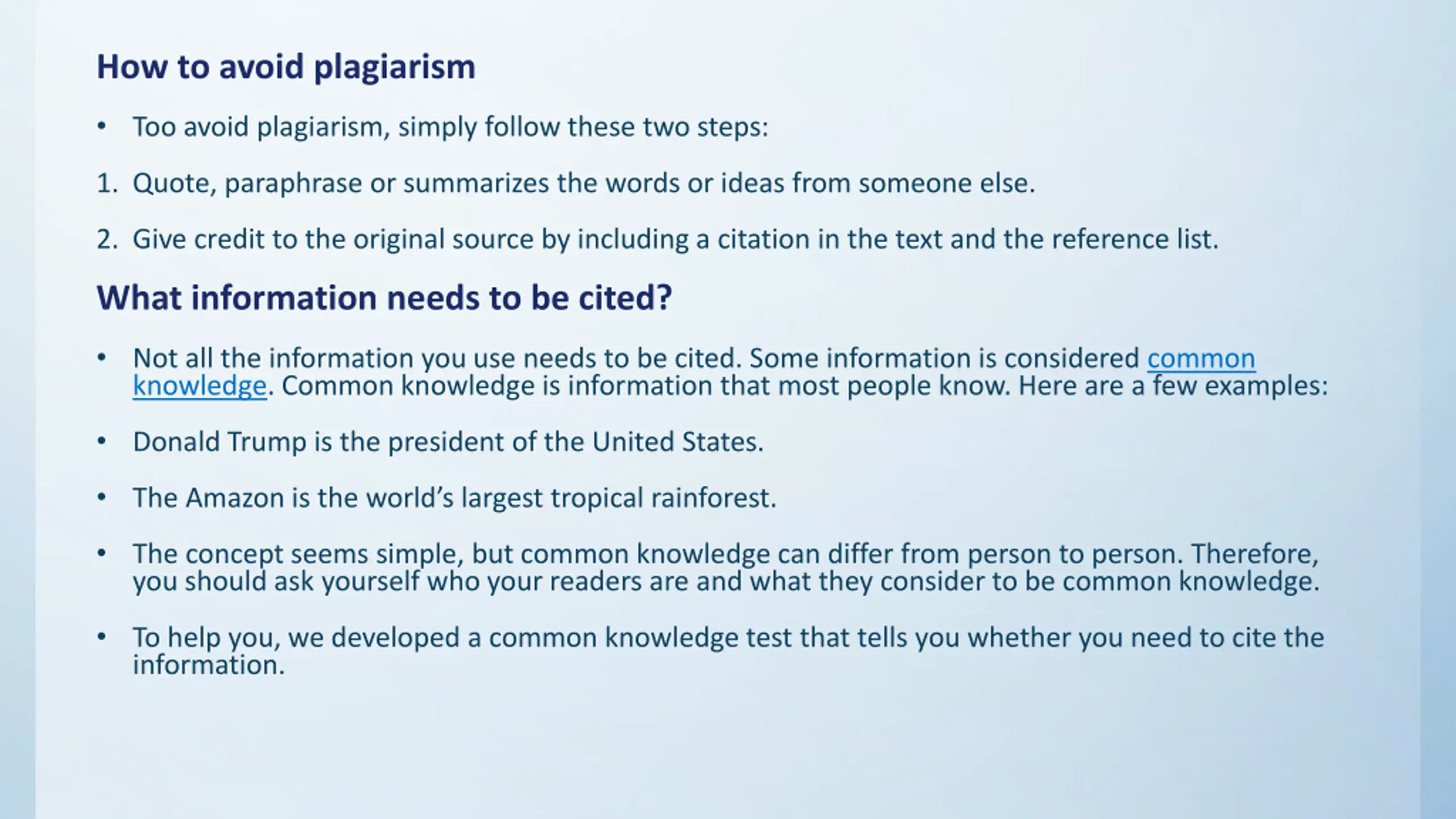 How to avoid plagiarism Too avoid plagiarism, simply follow these two steps: 1. Quote, paraphrase or summarizes the words or ideas from someone else. 2. Give credit to the original source by including a citation in the text and the reference list. What information needs to be cited? Not all the information you use needs to be cited. Some information is considered common knowledge. Common knowledge is information that most people know. Here are a few examples: Donald Trump is the president of the United States. The Amazon is the world s largest tropical rainforest. The concept seems simple, but common knowledge can differ from person to person. Therefore, you should ask yourself who your readers are and what they consider to be common knowledge. To help you, we developed a common knowledge test that tells you whether you need to cite the information.