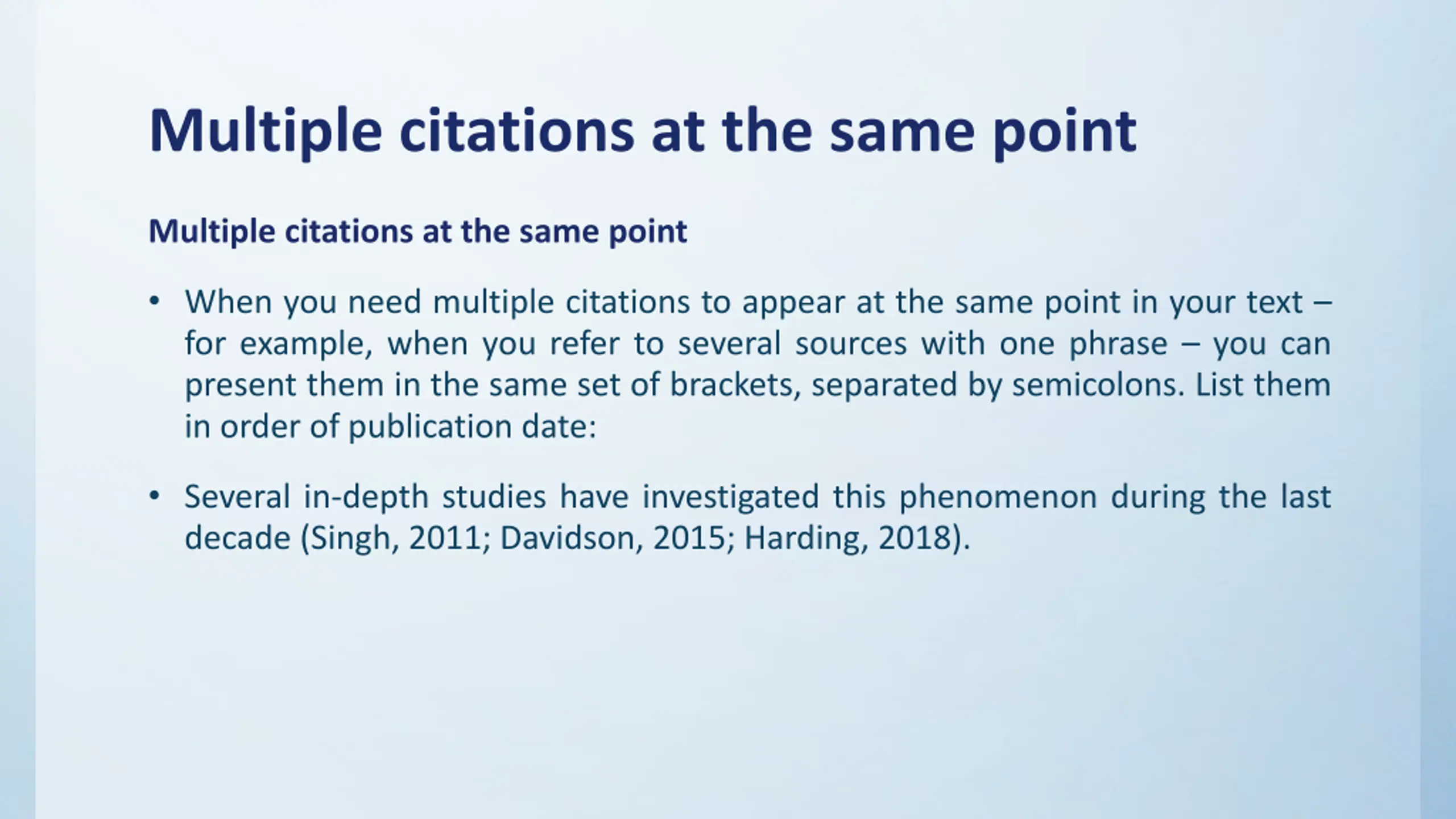 Multiple citations at the same point Multiple citations at the same point When you need multiple citations to appear at the same point in your text for example, when you refer to several sources with one phrase you can present them in the same set of brackets, separated by semicolons. List them in order of publication date: Several in-depth studies have investigated this phenomenon during the last decade (Singh, 2011; Davidson, 2015; Harding, 2018).