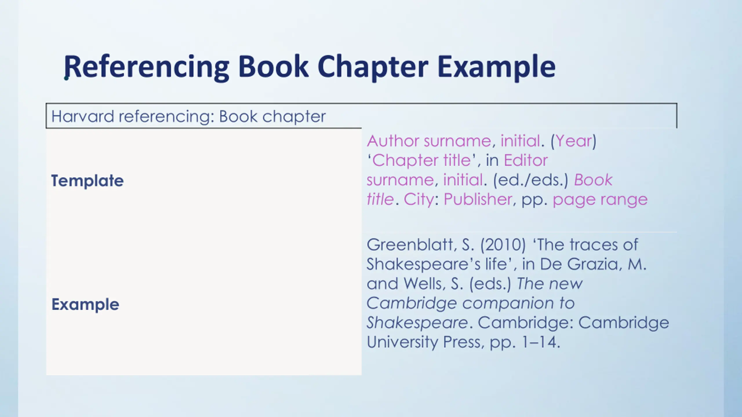 Referencing Book Chapter Example Harvard referencing: Book chapter Author surname, initial. (Year) Chapter title , in Editor surname, initial. (ed./eds.) Book title. City: Publisher, pp. page range Template Greenblatt, S. (2010) The traces of Shakespeare s life , in De Grazia, M. and Wells, S. (eds.) The new Cambridge companion to Shakespeare. Cambridge: Cambridge University Press, pp. 1 14. Example