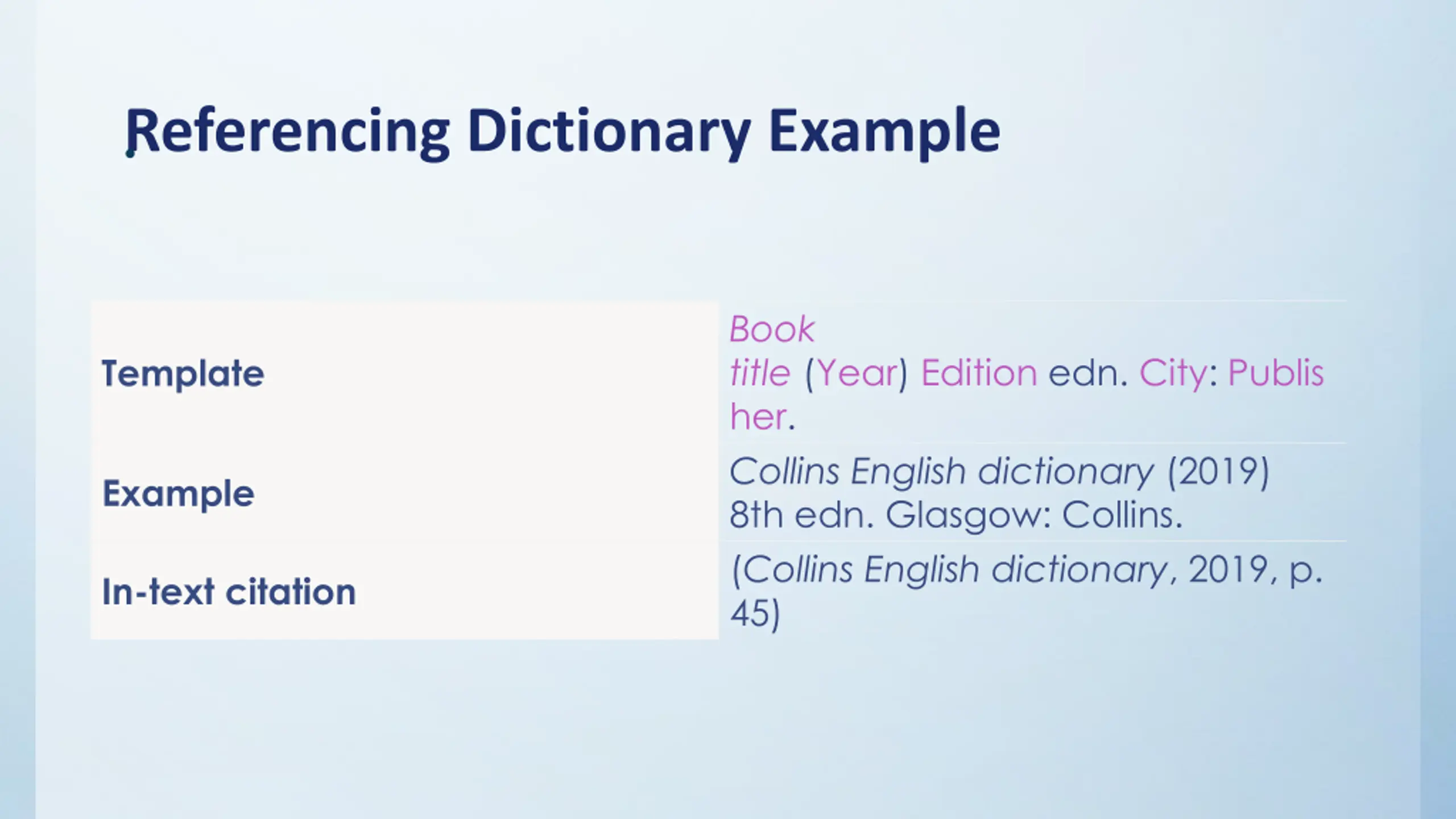 Referencing Dictionary Example Book title (Year) Edition edn. City: Publis her. Collins English dictionary (2019) 8th edn. Glasgow: Collins. (Collins English dictionary, 2019, p. 45) Template Example In-text citation