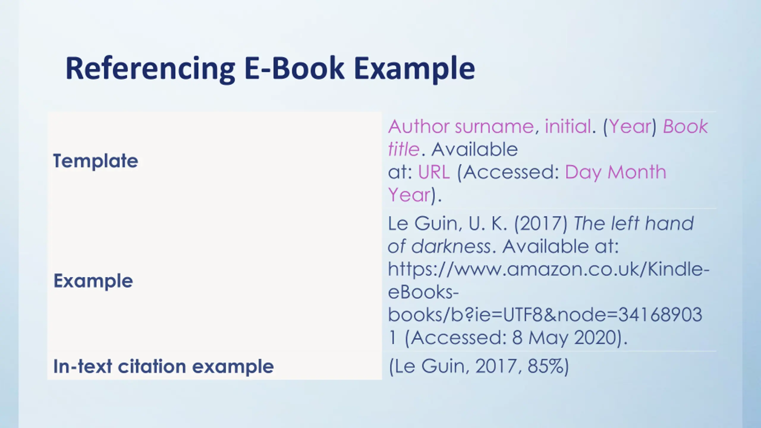 Referencing E-Book Example . Author surname, initial. (Year) Book title. Available at: URL (Accessed: Day Month Year). Le Guin, U. K. (2017) The left hand of darkness. Available at: https://www.amazon.co.uk/Kindle- eBooks- books/b?ie=UTF8&node=34168903 1 (Accessed: 8 May 2020). (Le Guin, 2017, 85%) Template Example In-text citation example