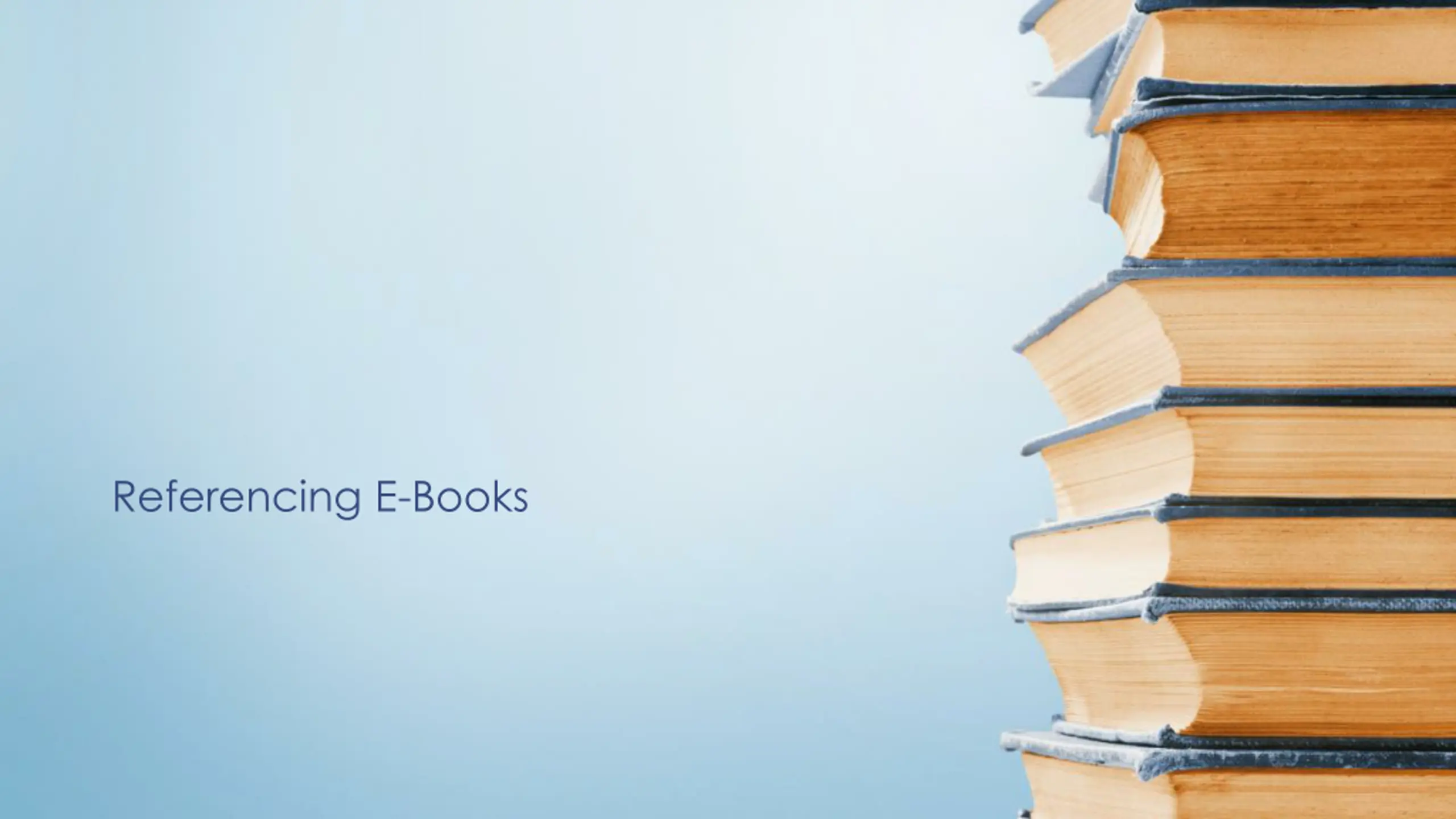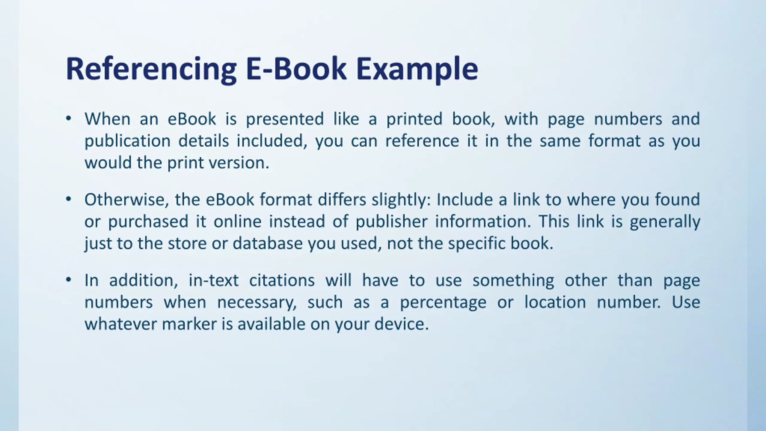 Referencing E-Book Example When an eBook is presented like a printed book, with page numbers and publication details included, you can reference it in the same format as you would the print version. Otherwise, the eBook format differs slightly: Include a link to where you found or purchased it online instead of publisher information. This link is generally just to the store or database you used, not the specific book. In addition, in-text citations will have to use something other than page numbers when necessary, such as a percentage or location number. Use whatever marker is available on your device.