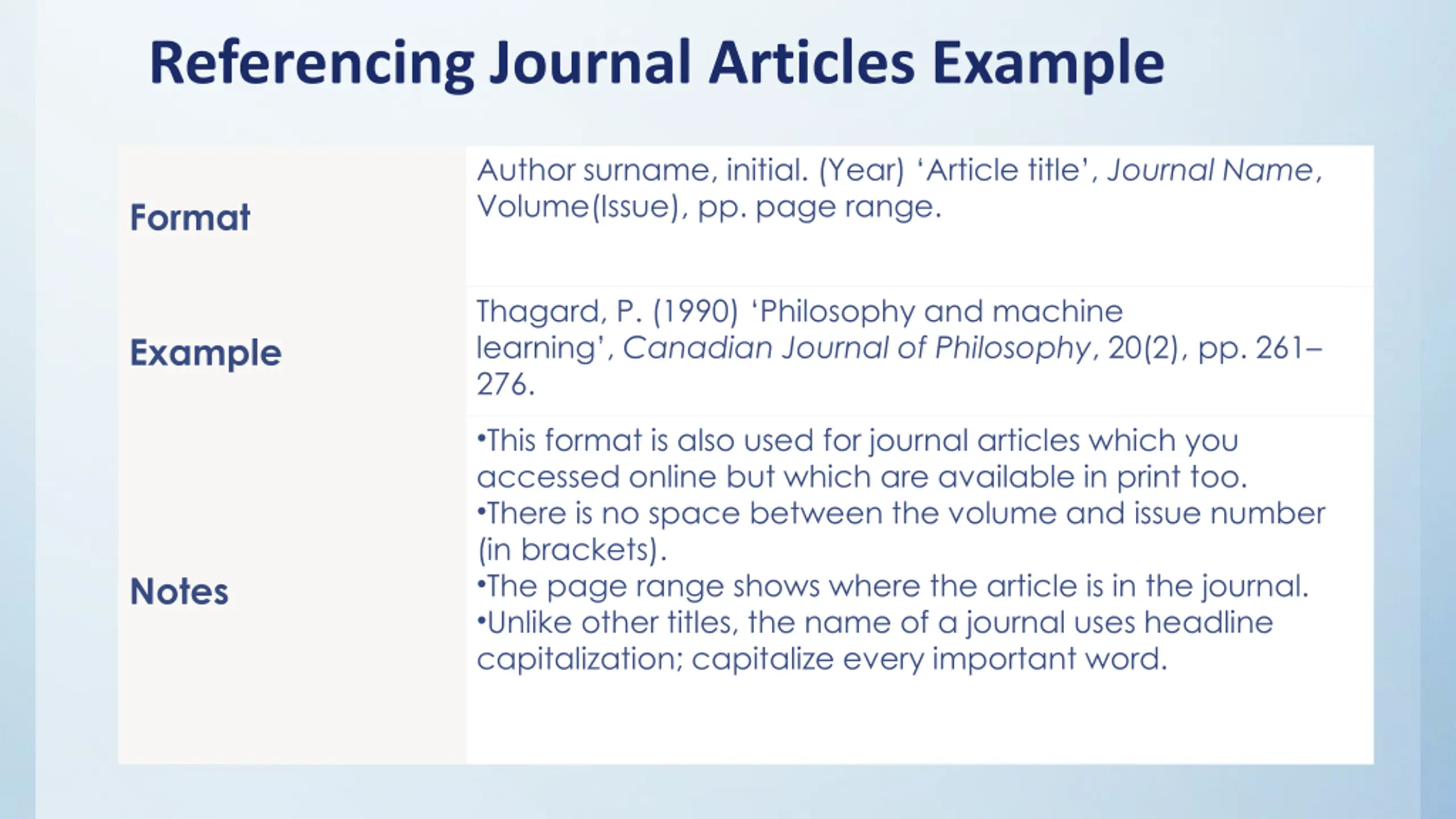Referencing Journal Articles Example Author surname, initial. (Year) Article title , Journal Name, Volume(Issue), pp. page range. Format Thagard, P. (1990) Philosophy and machine learning , Canadian Journal of Philosophy, 20(2), pp. 261 276. Example This format is also used for journal articles which you accessed online but which are available in print too. There is no space between the volume and issue number (in brackets). The page range shows where the article is in the journal. Unlike other titles, the name of a journal uses headline capitalization; capitalize every important word. Notes