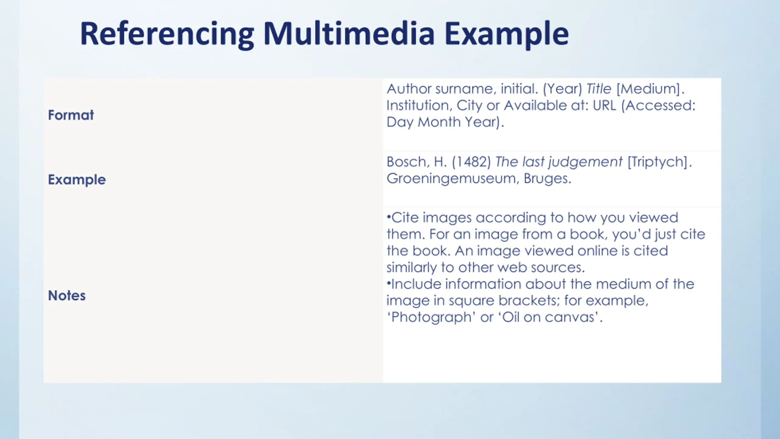 Referencing Multimedia Example Author surname, initial. (Year) Title [Medium]. Institution, City or Available at: URL (Accessed: Day Month Year). Format Bosch, H. (1482) The last judgement [Triptych]. Groeningemuseum, Bruges. Example Cite images according to how you viewed them. For an image from a book, you d just cite the book. An image viewed online is cited similarly to other web sources. Include information about the medium of the image in square brackets; for example, Photograph or Oil on canvas . Notes