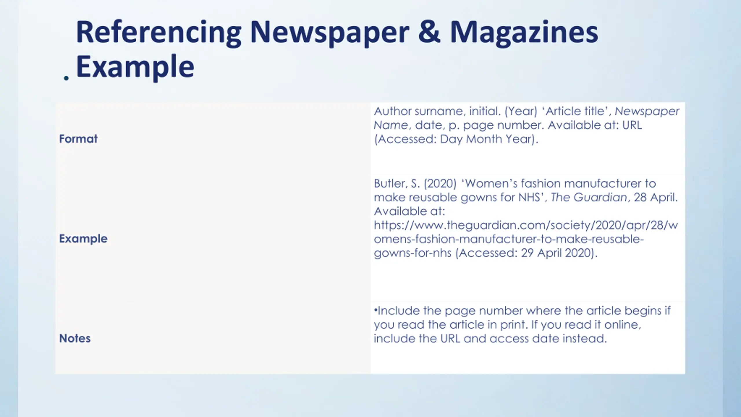 Referencing Newspaper & Magazines Example Author surname, initial. (Year) Article title , Newspaper Name, date, p. page number. Available at: URL (Accessed: Day Month Year). Format Butler, S. (2020) Women s fashion manufacturer to make reusable gowns for NHS , The Guardian, 28 April. Available at: https://www.theguardian.com/society/2020/apr/28/w omens-fashion-manufacturer-to-make-reusable- gowns-for-nhs (Accessed: 29 April 2020). Example Include the page number where the article begins if you read the article in print. If you read it online, include the URL and access date instead. Notes
