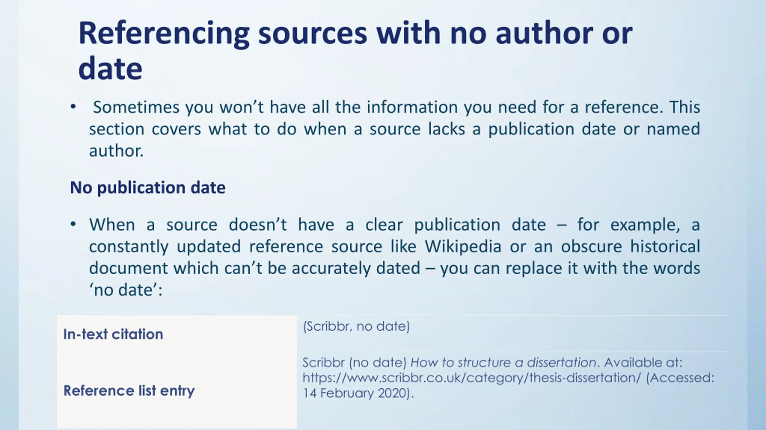 Referencing sources with no author or date Sometimes you won t have all the information you need for a reference. This section covers what to do when a source lacks a publication date or named author. No publication date When a source doesn t have a clear publication date for example, a constantly updated reference source like Wikipedia or an obscure historical document which can t be accurately dated you can replace it with the words no date : (Scribbr, no date) In-text citation Scribbr (no date) How to structure a dissertation. Available at: https://www.scribbr.co.uk/category/thesis-dissertation/ (Accessed: 14 February 2020). Reference list entry