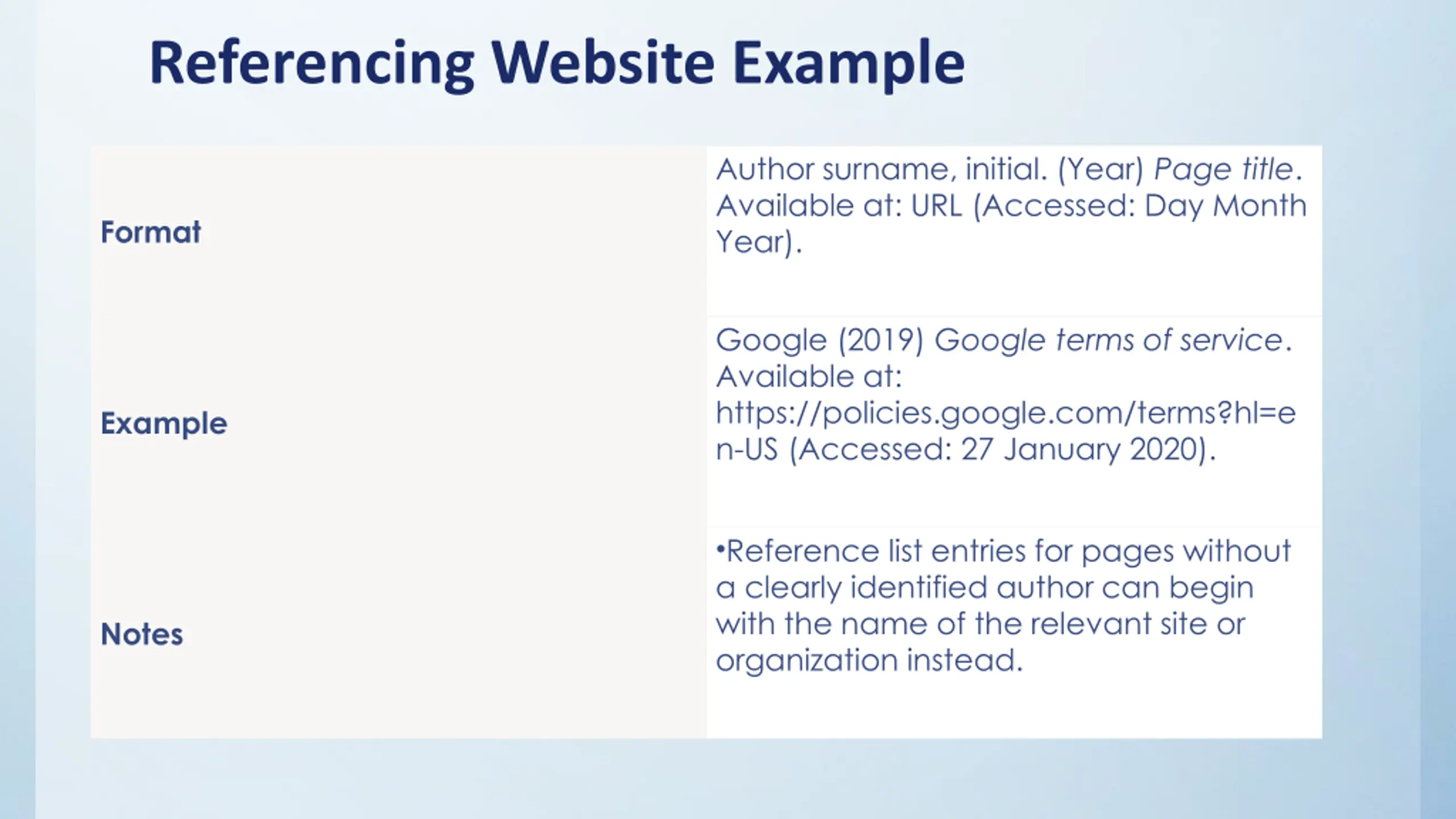 Referencing Website Example Author surname, initial. (Year) Page title. Available at: URL (Accessed: Day Month Year). Format Google (2019) Google terms of service. Available at: https://policies.google.com/terms?hl=e n-US (Accessed: 27 January 2020). Example Reference list entries for pages without a clearly identified author can begin with the name of the relevant site or organization instead. Notes