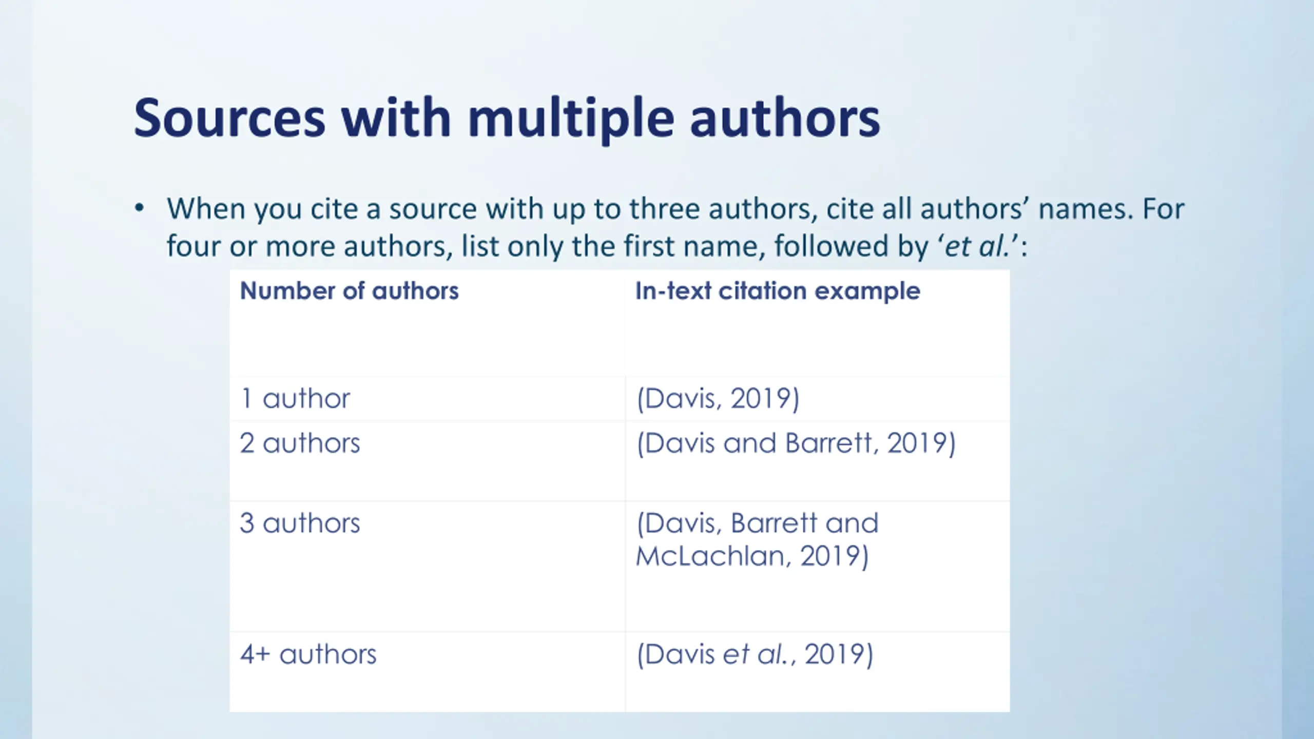 Sources with multiple authors When you cite a source with up to three authors, cite all authors names. For four or more authors, list only the first name, followed by et al. : Number of authors In-text citation example 1 author 2 authors (Davis, 2019) (Davis and Barrett, 2019) 3 authors (Davis, Barrett and McLachlan, 2019) 4+ authors (Davis et al., 2019)