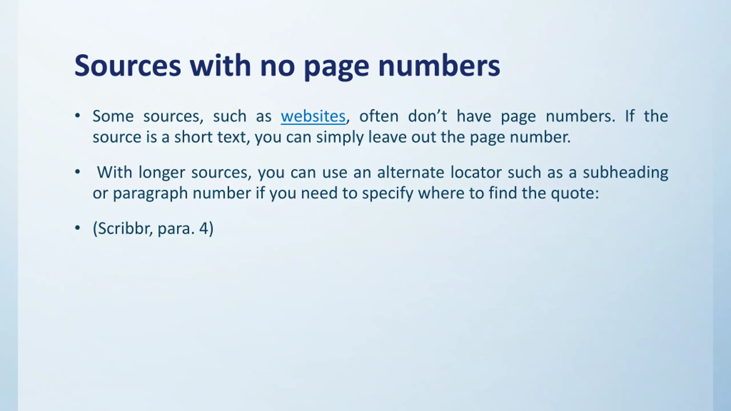 Sources with no page numbers Some sources, such as websites, often don t have page numbers. If the source is a short text, you can simply leave out the page number. With longer sources, you can use an alternate locator such as a subheading or paragraph number if you need to specify where to find the quote: (Scribbr, para. 4)