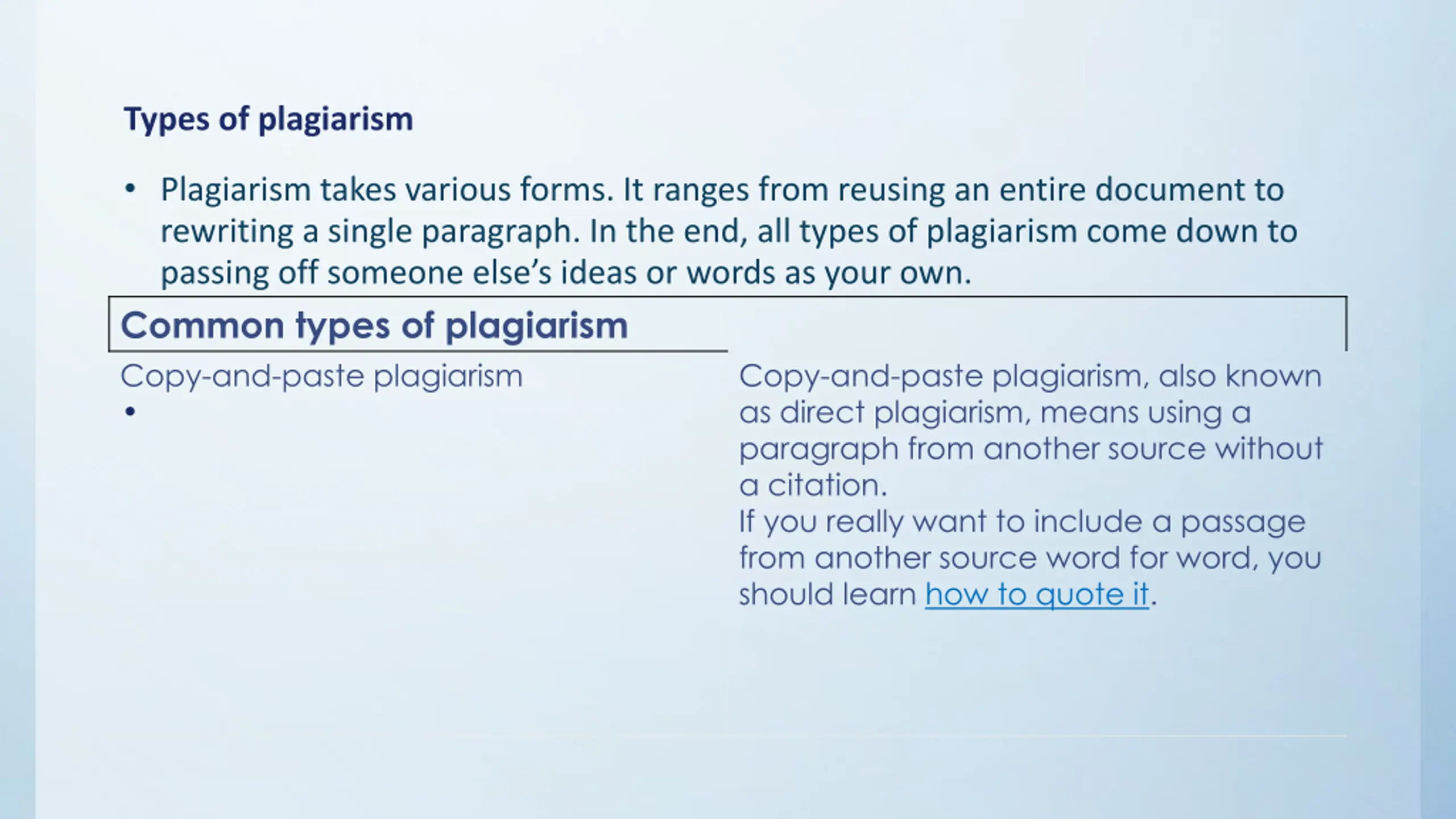 Types of plagiarism Plagiarism takes various forms. It ranges from reusing an entire document to rewriting a single paragraph. In the end, all types of plagiarism come down to passing off someone else s ideas or words as your own. Common types of plagiarism Copy-and-paste plagiarism Copy-and-paste plagiarism, also known as direct plagiarism, means using a paragraph from another source without a citation. If you really want to include a passage from another source word for word, you should learn how to quote it.
