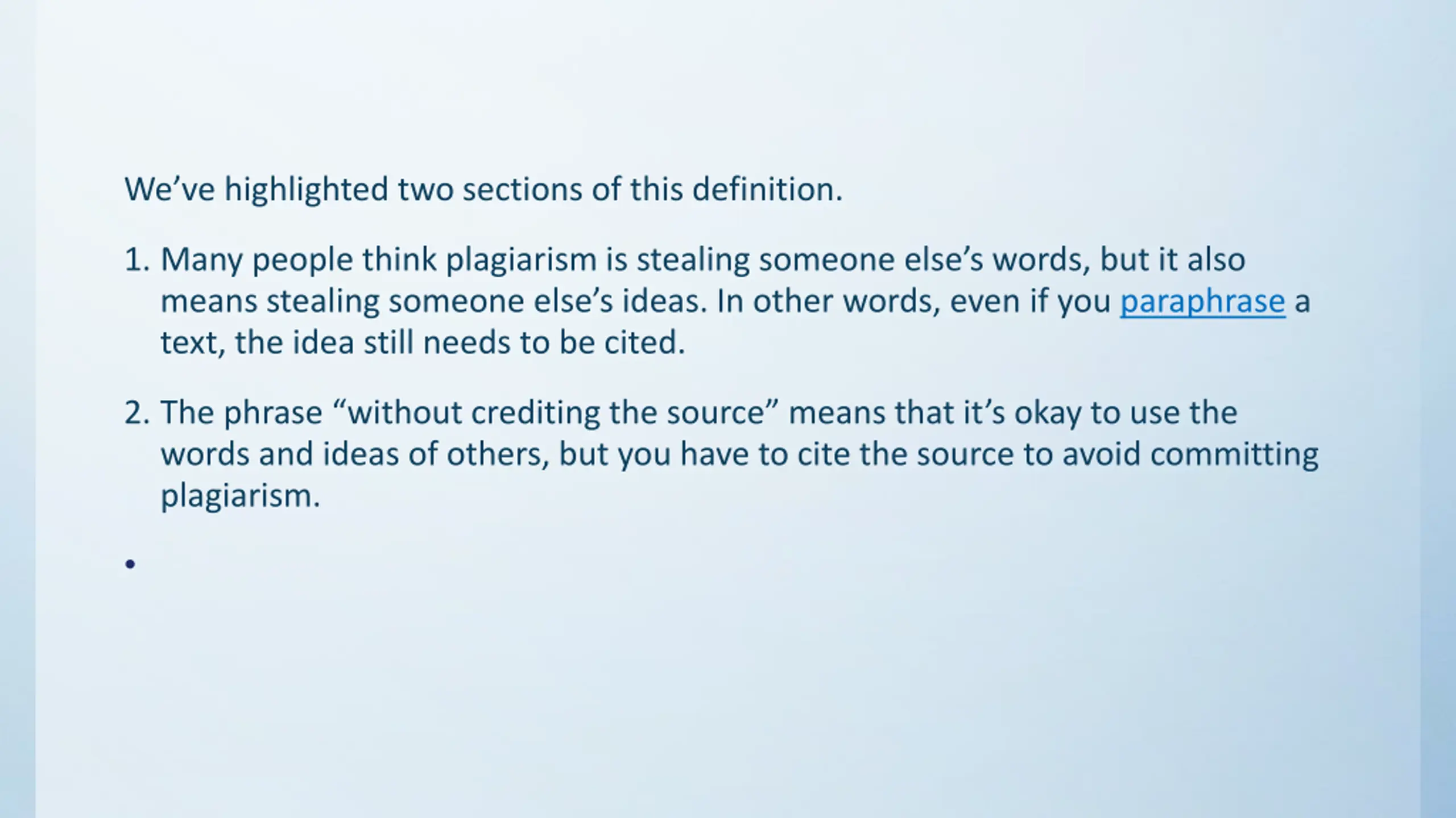 Weve highlighted two sections of this definition. 1. Many people think plagiarism is stealing someone else s words, but it also means stealing someone else s ideas. In other words, even if you paraphrase a text, the idea still needs to be cited. 2. The phrase without crediting the source means that it s okay to use the words and ideas of others, but you have to cite the source to avoid committing plagiarism.