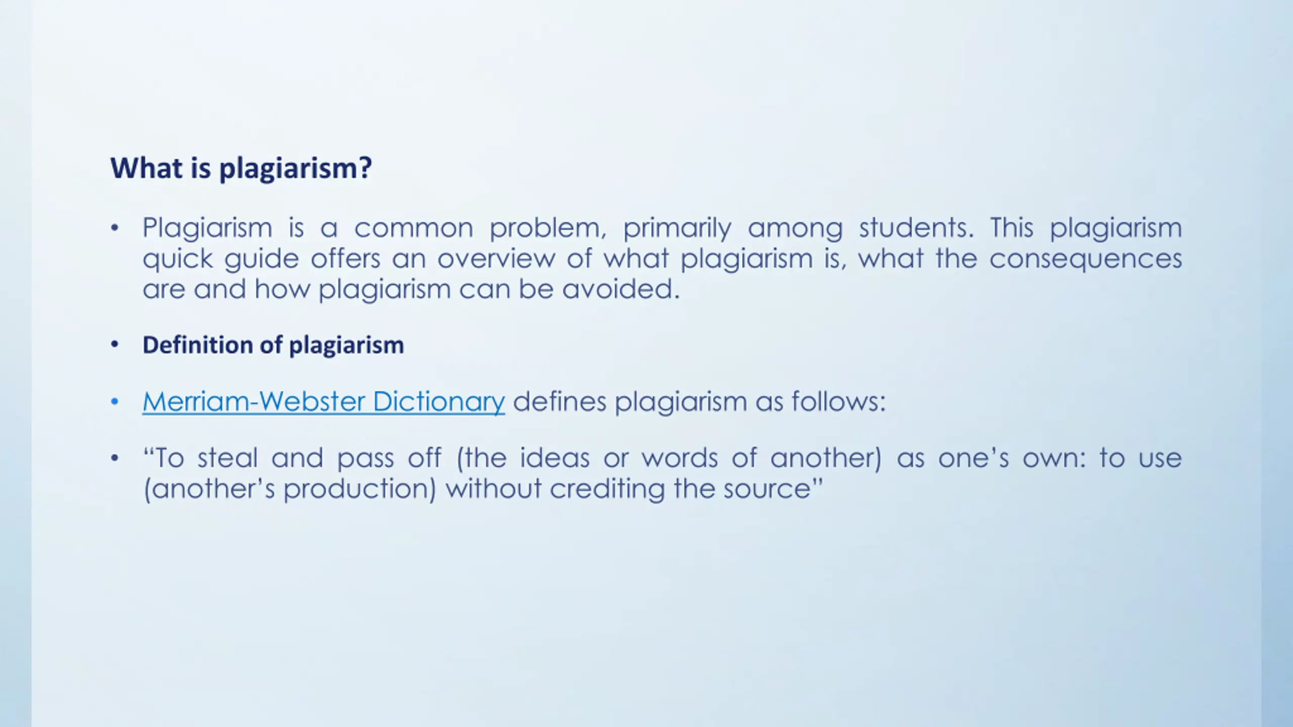 What is plagiarism? Plagiarism is a common problem, primarily among students. This plagiarism quick guide offers an overview of what plagiarism is, what the consequences are and how plagiarism can be avoided. Definition of plagiarism Merriam-Webster Dictionary defines plagiarism as follows: To steal and pass off (the ideas or words of another) as one s own: to use (another s production) without crediting the source