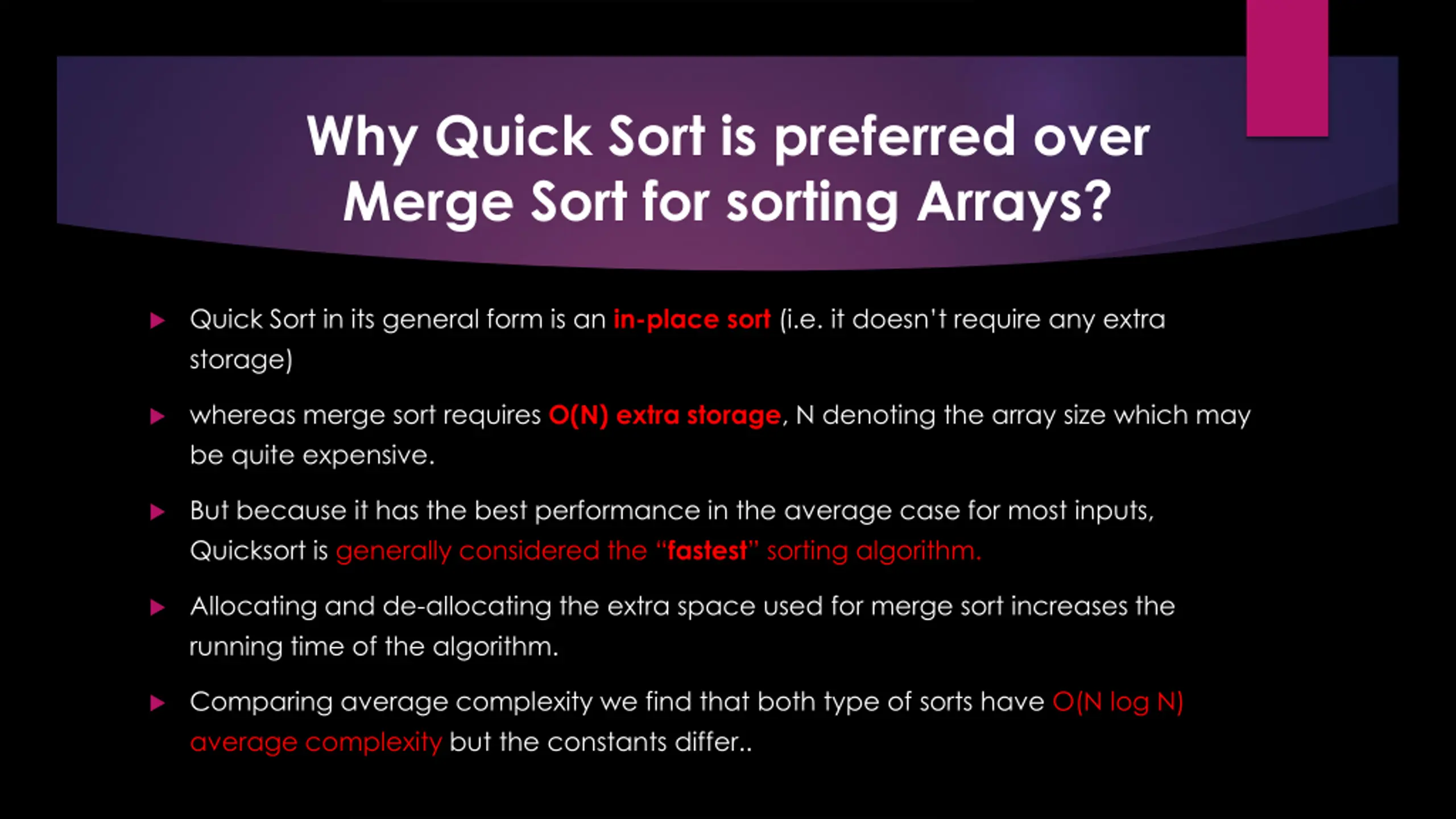 Why Quick Sort is preferred over Merge Sort for sorting Arrays? Quick Sort in its general form is an in-place sort (i.e. it doesn t require any extra storage) whereas merge sort requires O(N) extra storage, N denoting the array size which may be quite expensive. But because it has the best performance in the average case for most inputs, Quicksort is generally considered the fastest sorting algorithm. Allocating and de-allocating the extra space used for merge sort increases the running time of the algorithm. Comparing average complexity we find that both type of sorts have O(N log N) average complexity but the constants differ..