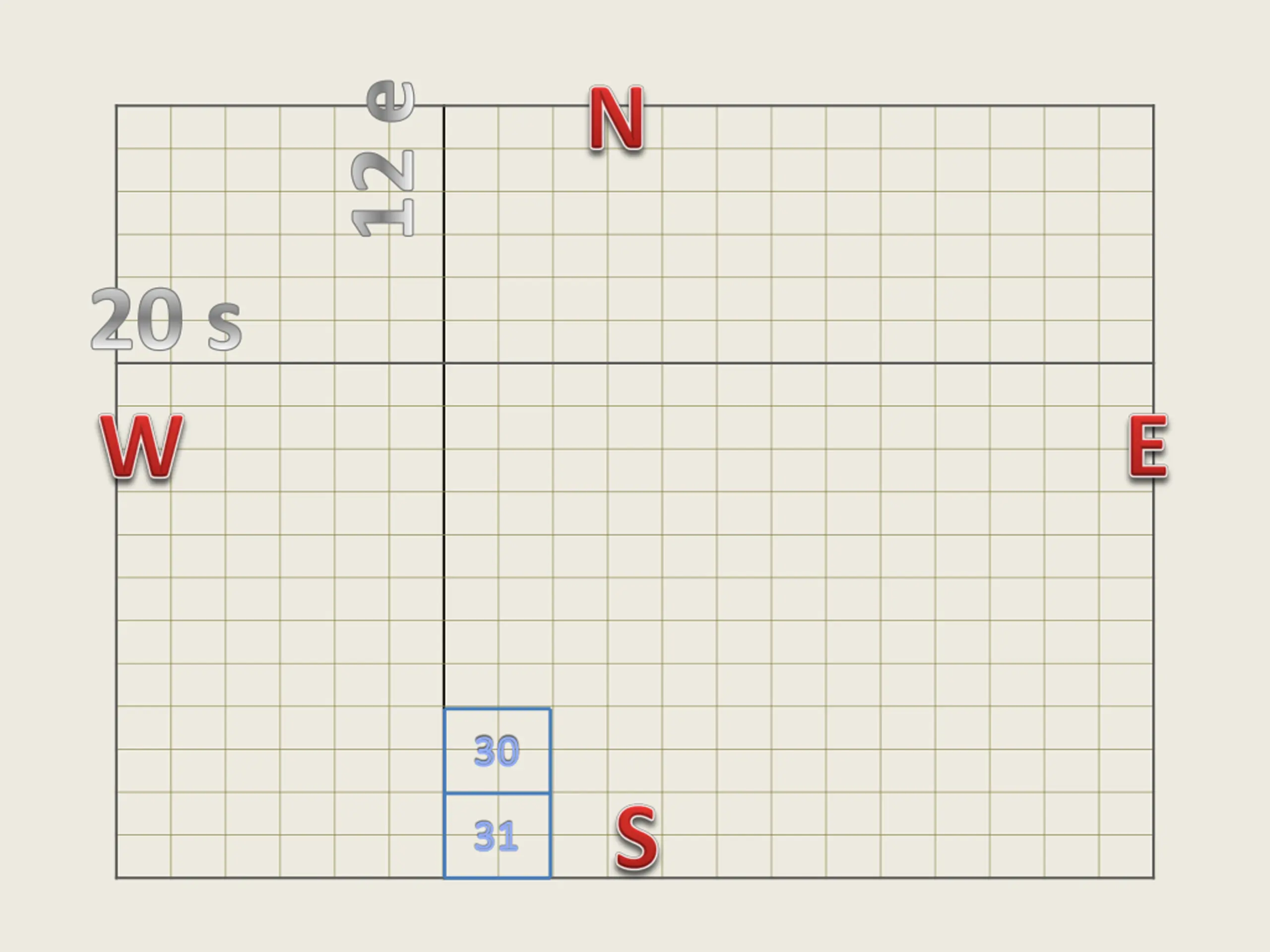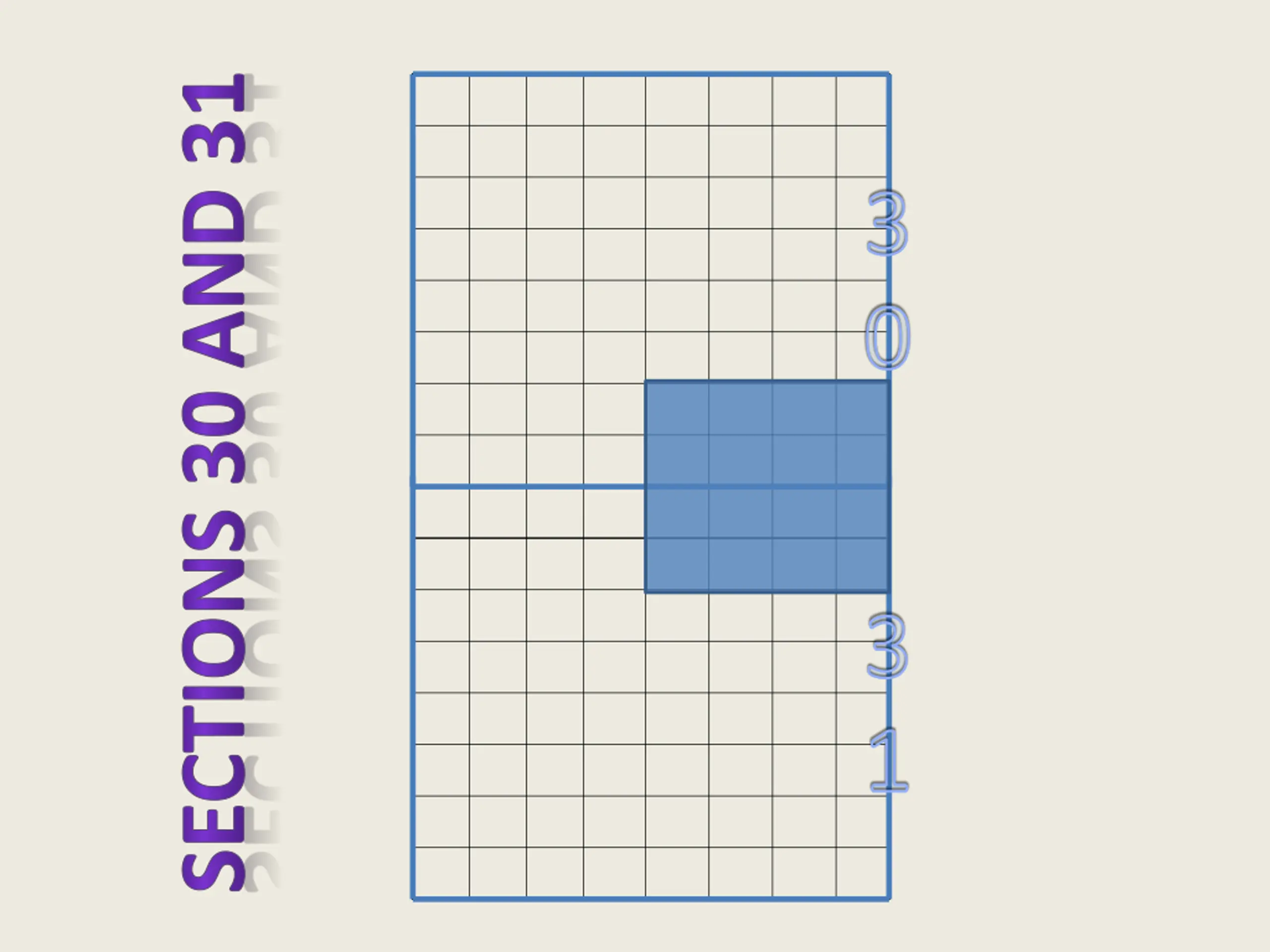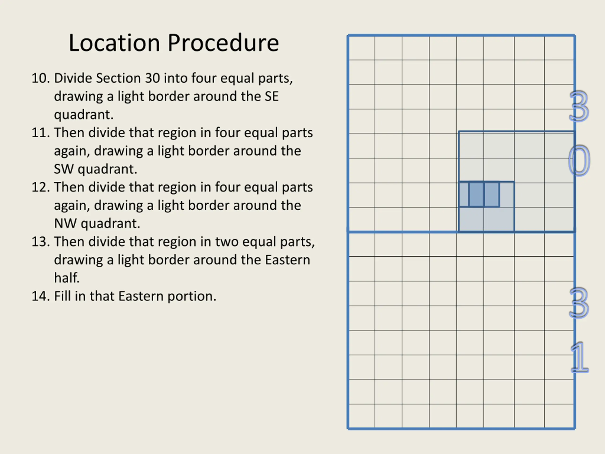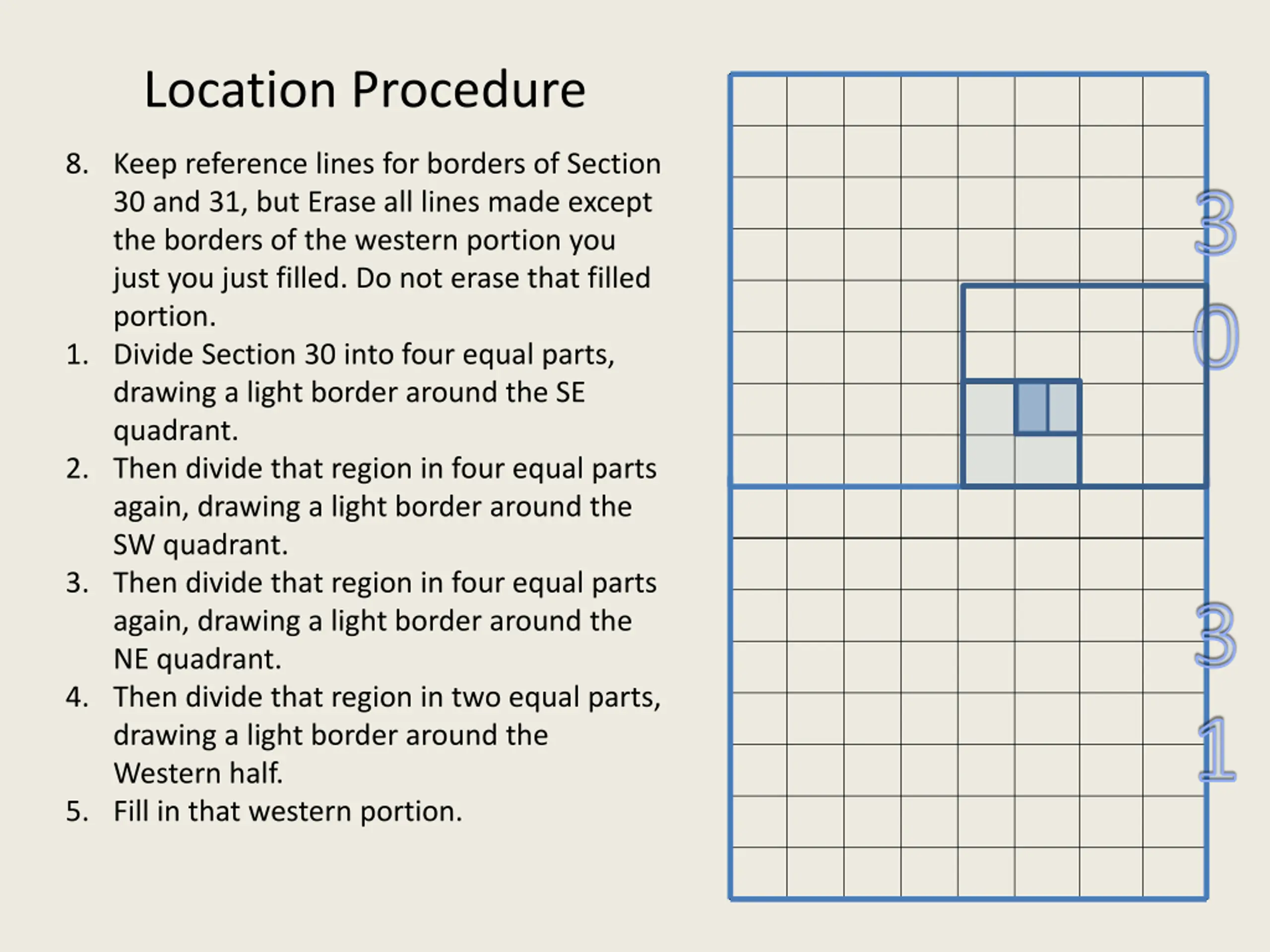 Location Procedure 10. Divide Section 30 into four equal parts, drawing a light border around the SE quadrant. 11. Then divide that region in four equal parts again, drawing a light border around the SW quadrant. 12. Then divide that region in four equal parts again, drawing a light border around the NW quadrant. 13. Then divide that region in two equal parts, drawing a light border around the Eastern half. 14. Fill in that Eastern portion. 3 0 3 1
