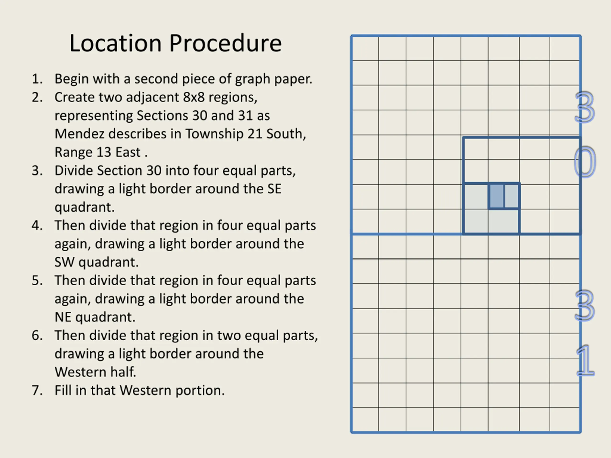 Location Procedure 1. Begin with a second piece of graph paper. 2. Create two adjacent 8x8 regions, representing Sections 30 and 31 as Mendez describes in Township 21 South, Range 13 East . 3. Divide Section 30 into four equal parts, drawing a light border around the SE quadrant. 4. Then divide that region in four equal parts again, drawing a light border around the SW quadrant. 5. Then divide that region in four equal parts again, drawing a light border around the NE quadrant. 6. Then divide that region in two equal parts, drawing a light border around the Western half. 7. Fill in that Western portion. 3 0 3 1