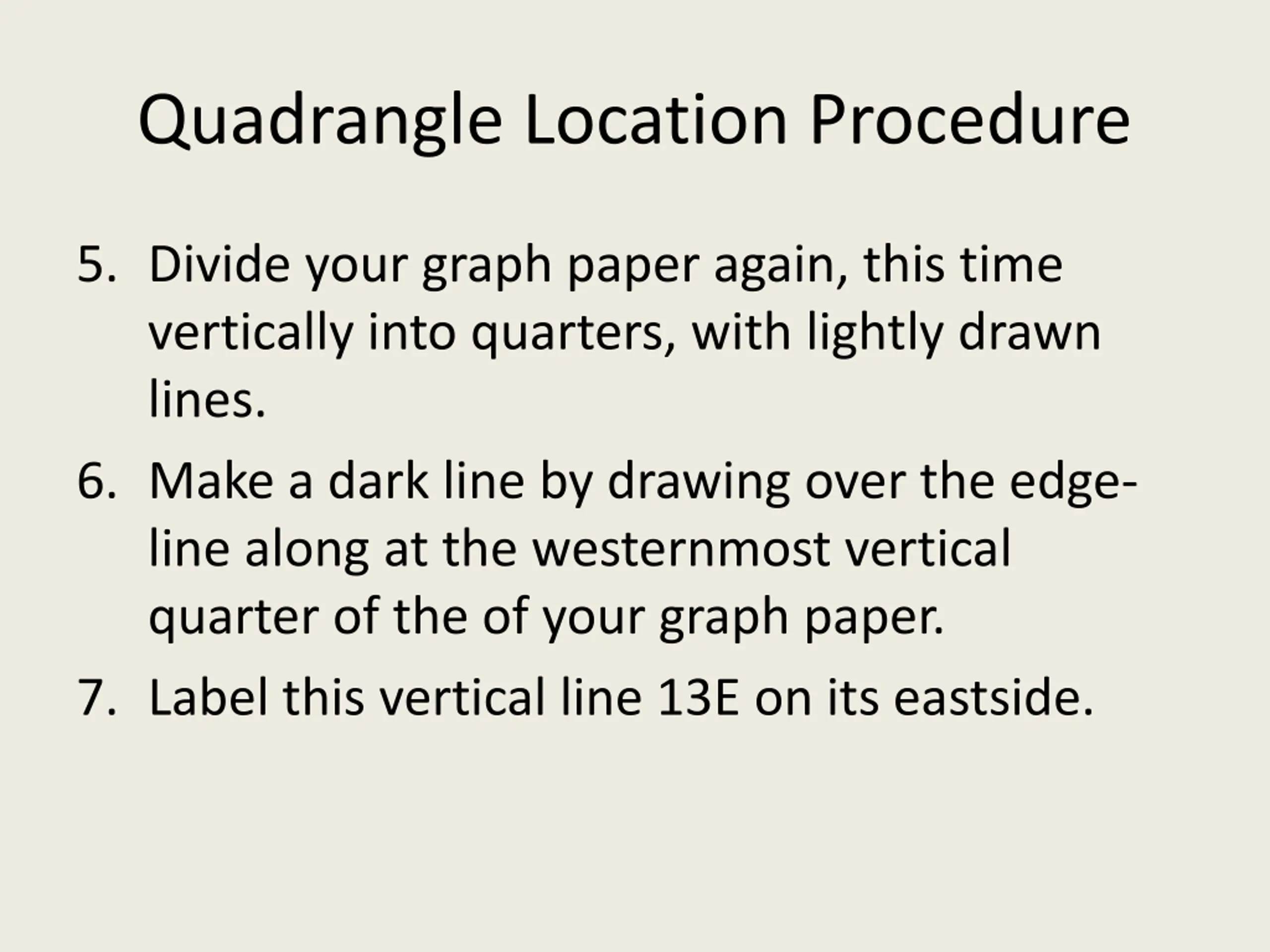 Quadrangle Location Procedure 5. Divide your graph paper again, this time vertically into quarters, with lightly drawn lines. 6. Make a dark line by drawing over the edge- line along at the westernmost vertical quarter of the of your graph paper. 7. Label this vertical line 13E on its eastside.