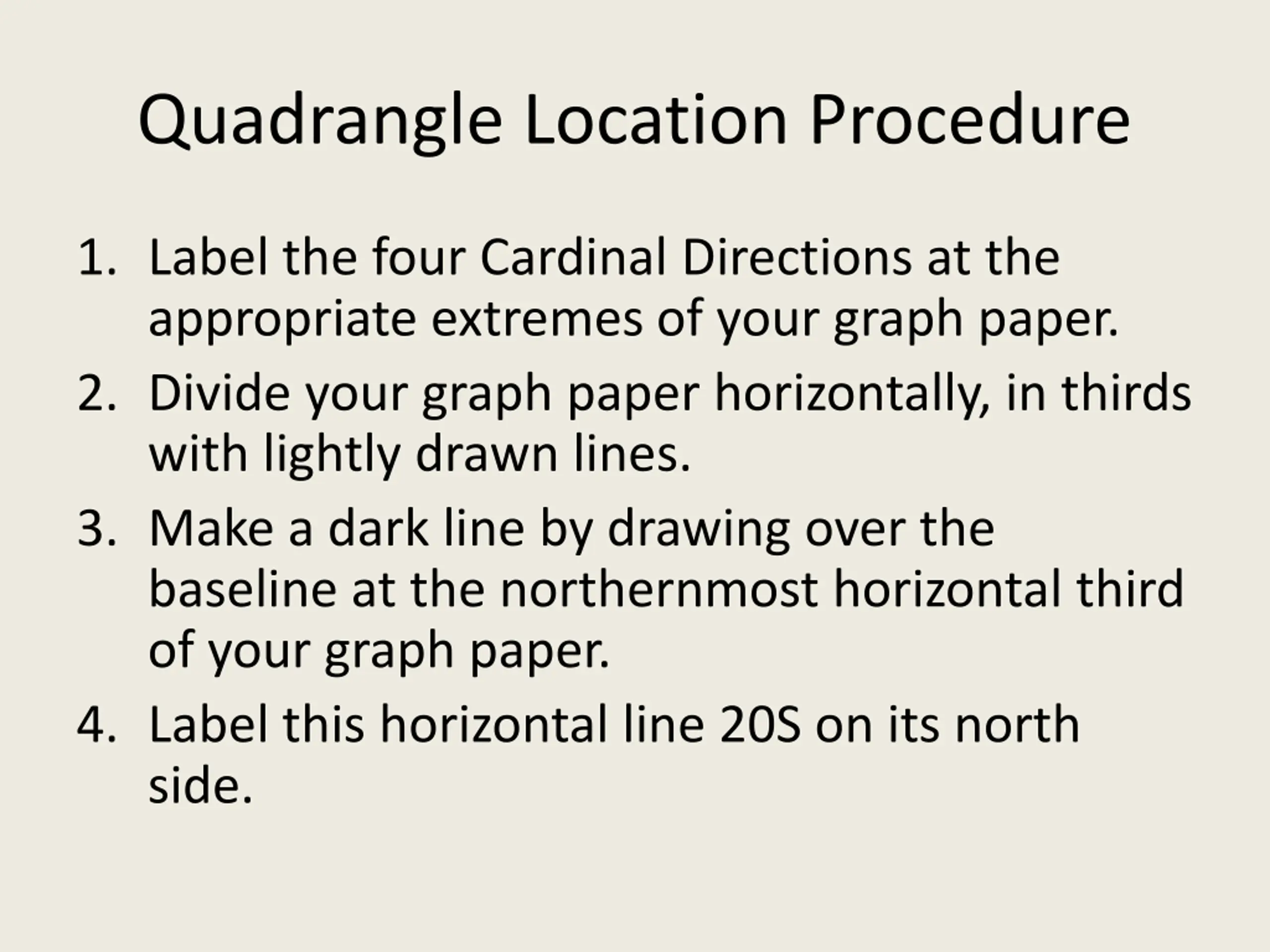 Quadrangle Location Procedure 1. Label the four Cardinal Directions at the appropriate extremes of your graph paper. 2. Divide your graph paper horizontally, in thirds with lightly drawn lines. 3. Make a dark line by drawing over the baseline at the northernmost horizontal third of your graph paper. 4. Label this horizontal line 20S on its north side.