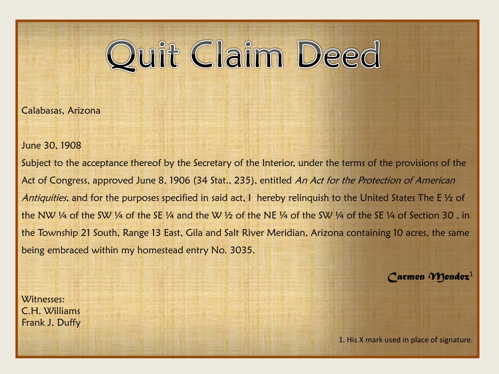 Quit Claim Deed Quit Claim Deed Calabasas, Arizona June 30, 1908 Subject to the acceptance thereof by the Secretary of the Interior, under the terms of the provisions of the Act of Congress, approved June 8, 1906 (34 Stat., 235), entitled An Act for the Protection of American Antiquities, and for the purposes specified in said act, I hereby relinquish to the United States The E of the NW of the SW of the SE and the W of the NE of the SW of the SE of Section 30 , in the Township 21 South, Range 13 East, Gila and Salt River Meridian, Arizona containing 10 acres, the same being embraced within my homestead entry No. 3035. Carmen Mendez1 Witnesses: C.H. Williams Frank J. Duffy 1. His X mark used in place of signature.
